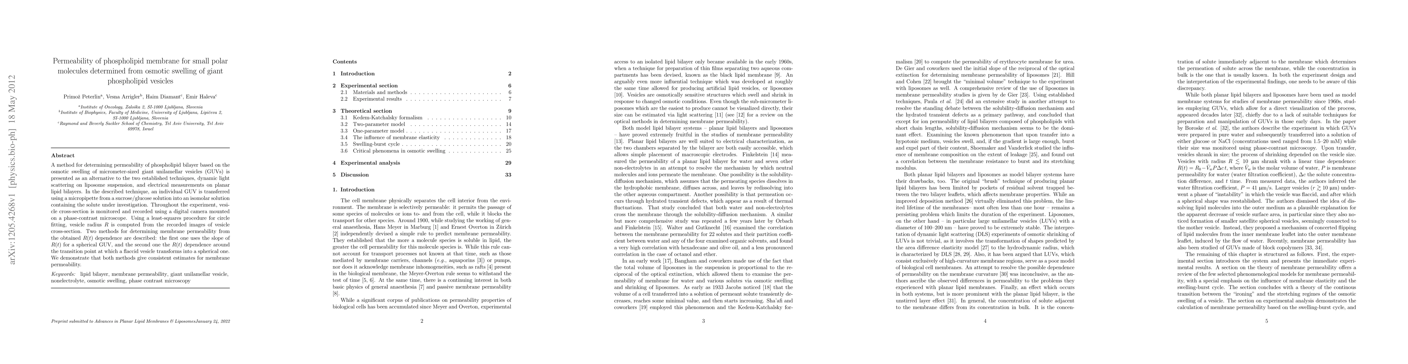 This paper presents a novel method for measuring the permeability of phospholipid membranes using osmotic swelling of giant unilamellar vesicles (GUVs) and compares it to established techniques. The method involves monitoring vesicle radius changes over time to determine membrane permeability, yielding consistent results.
