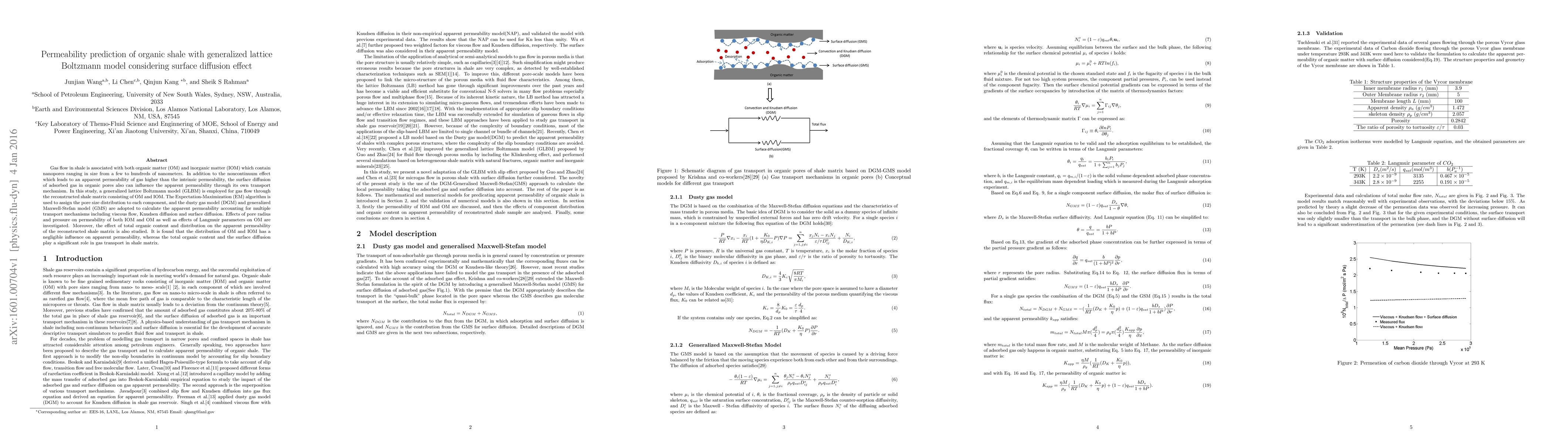 This study uses a generalized lattice Boltzmann model to predict gas permeability in organic shale, considering surface diffusion effects. The model incorporates pore size distribution, viscous flow, Knudsen diffusion, and surface diffusion, revealing that total organic content and surface diffusion significantly influence gas transport, while the distribution of organic and inorganic matter has minimal impact.