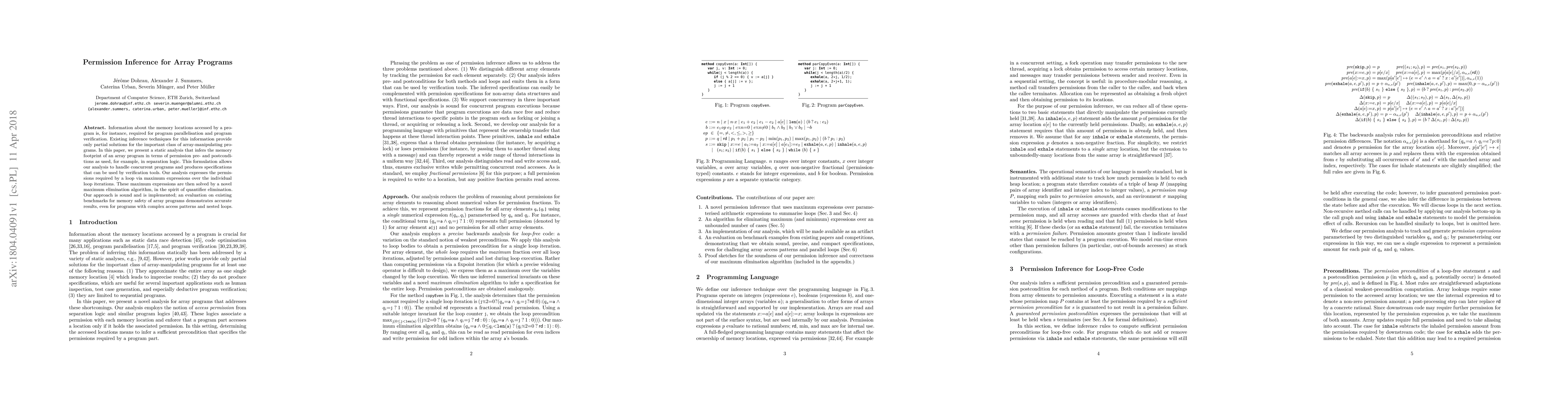 This paper introduces a static analysis technique to infer the memory footprint of array programs, expressed as permission pre- and postconditions, enabling better parallelization and verification. The method uses maximum elimination to solve permissions required by loops, demonstrating soundness and accuracy on benchmark tests.