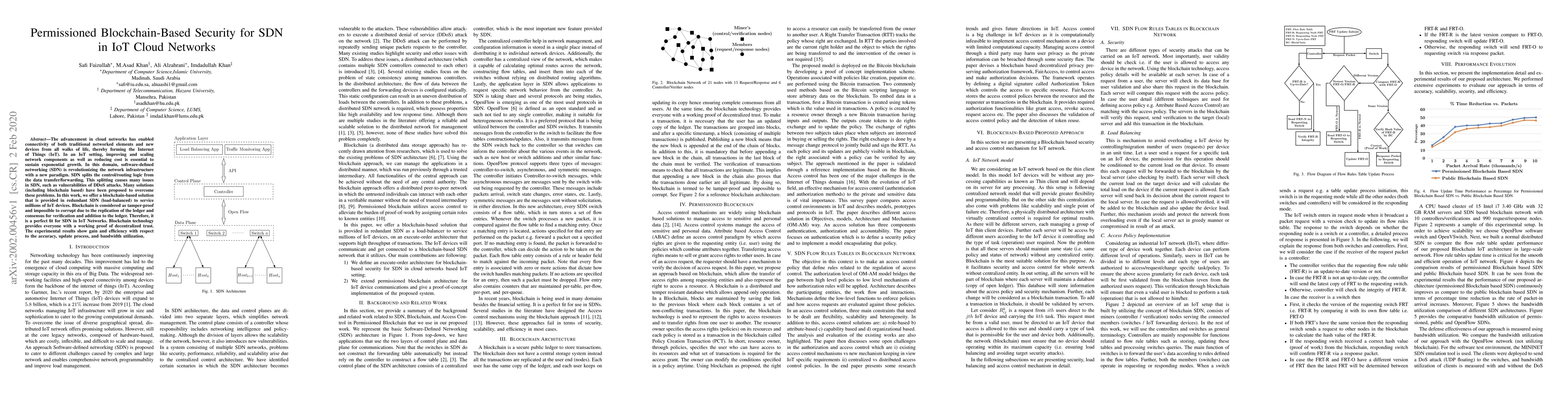 This paper proposes a blockchain-based security solution for software-defined networking (SDN) in IoT cloud networks to address vulnerabilities such as DDoS attacks. The redundant SDN approach with blockchain enhances trust, accuracy, and bandwidth efficiency for millions of IoT devices.