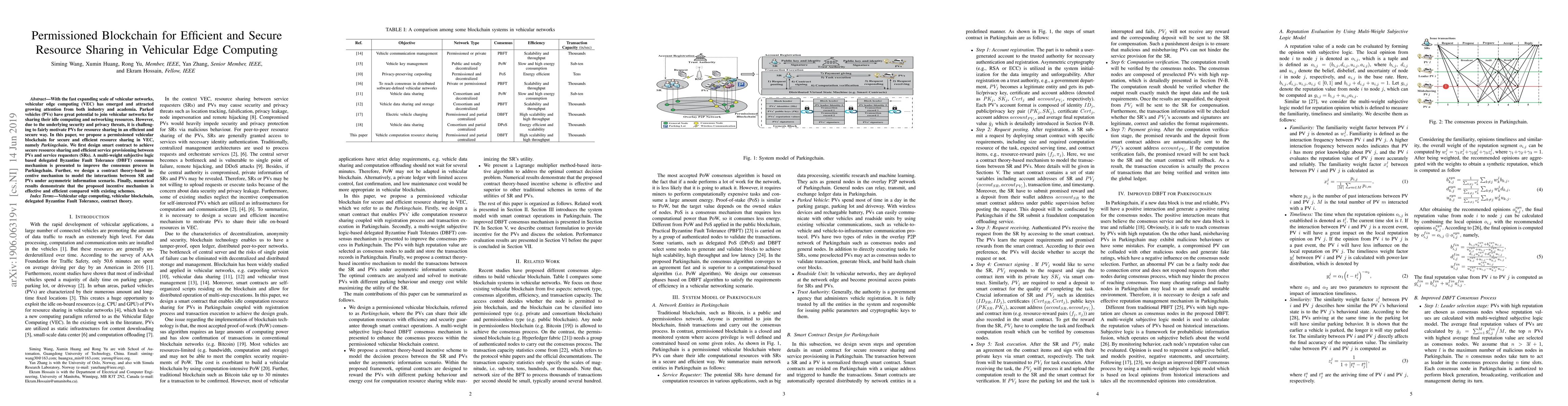This paper proposes Parkingchain, a permissioned blockchain for secure and efficient resource sharing in vehicular edge computing (VEC). It utilizes a multi-weight subjective logic based DBFT consensus mechanism and a contract theory-based incentive mechanism to motivate parked vehicles for resource sharing, demonstrating improved efficiency and security over existing methods.