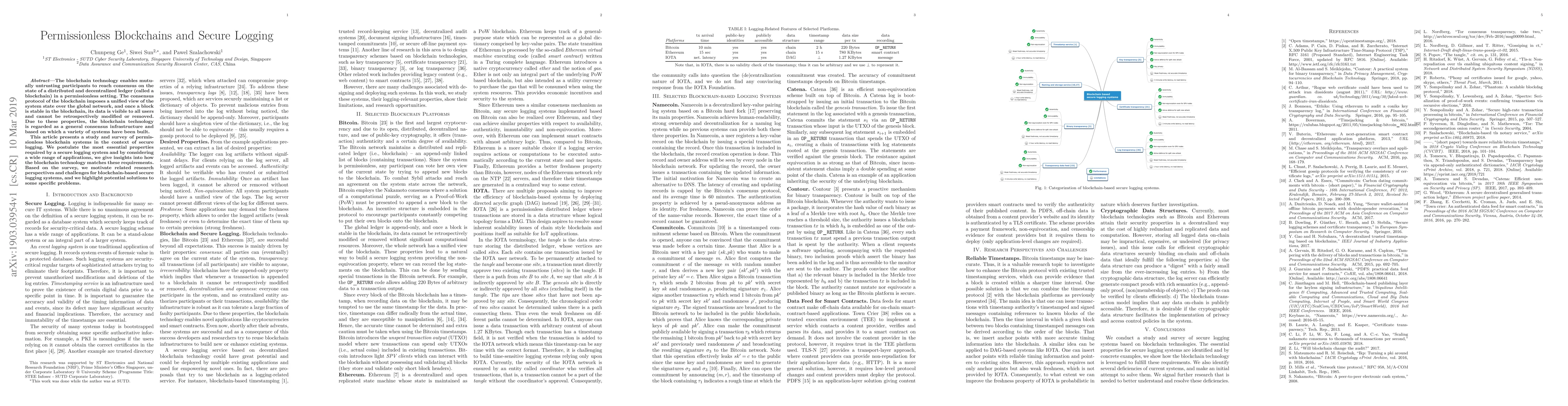 The blockchain technology enables mutually untrusting participants to reach consensus on the state of a distributed and decentralized ledger (called a blockchain) in a permissionless setting. The consensus protocol of the blockchain imposes a unified view of the system state over the global network, and once a block is stable in the blockchain, its data is visible to all users and cannot be retrospectively modified or removed. Due to these properties, the blockchain technology is regarded as a general consensus infrastructure and based on which a variety of systems have been built. This article presents a study and survey of permissionless blockchain systems in the context of secure logging. We postulate the most essential properties required by a secure logging system and by considering a wide range of applications, we give insights into how the blockchain technology matches these requirements. Based on the survey, we motivate related research perspectives and challenges for blockchain-based secure logging systems, and we highlight potential solutions to some specific problems.