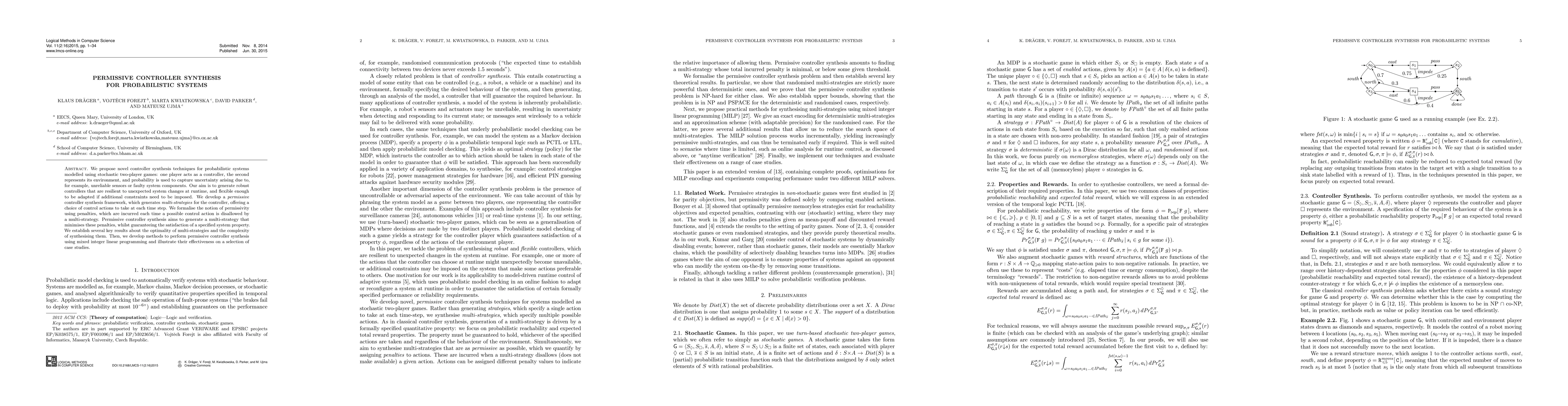 This paper introduces novel controller synthesis techniques for probabilistic systems represented by stochastic two-player games, focusing on generating robust and adaptable controllers. It proposes a permissive controller synthesis framework that minimizes penalties for disallowed control actions while ensuring system properties are met, employing mixed integer linear programming for practical implementation.