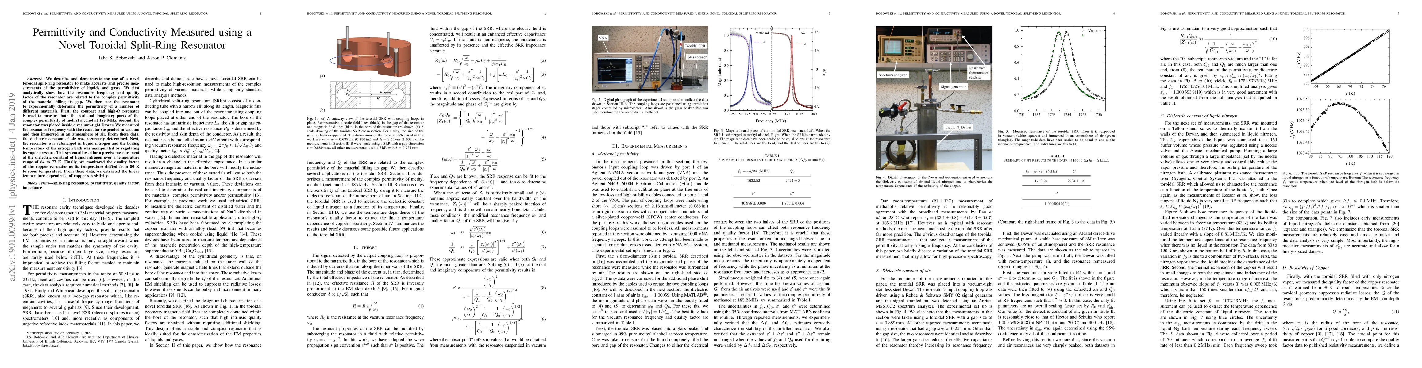 This paper introduces a novel toroidal split-ring resonator for precise measurements of material permittivity and conductivity. The resonator's resonance frequency and quality factor are analytically linked to material permittivity, and it is used to determine the dielectric constants of air, liquid nitrogen, and the temperature dependence of copper's resistivity.