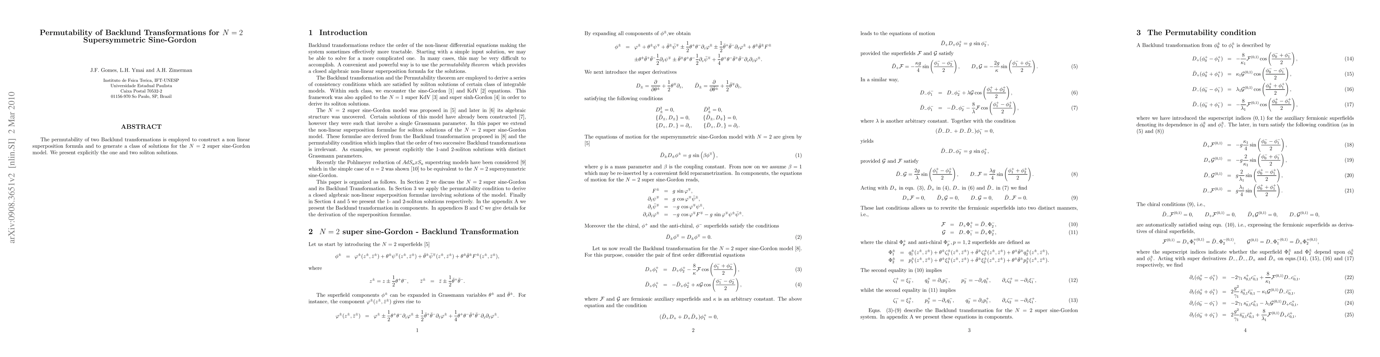Summary: This paper explores the permutability of two Backlund transformations to develop a nonlinear superposition formula and derive a new class of solutions for the N=2 supersymmetric sine-Gordon model. The findings enhance the understanding of the model's solution structure.