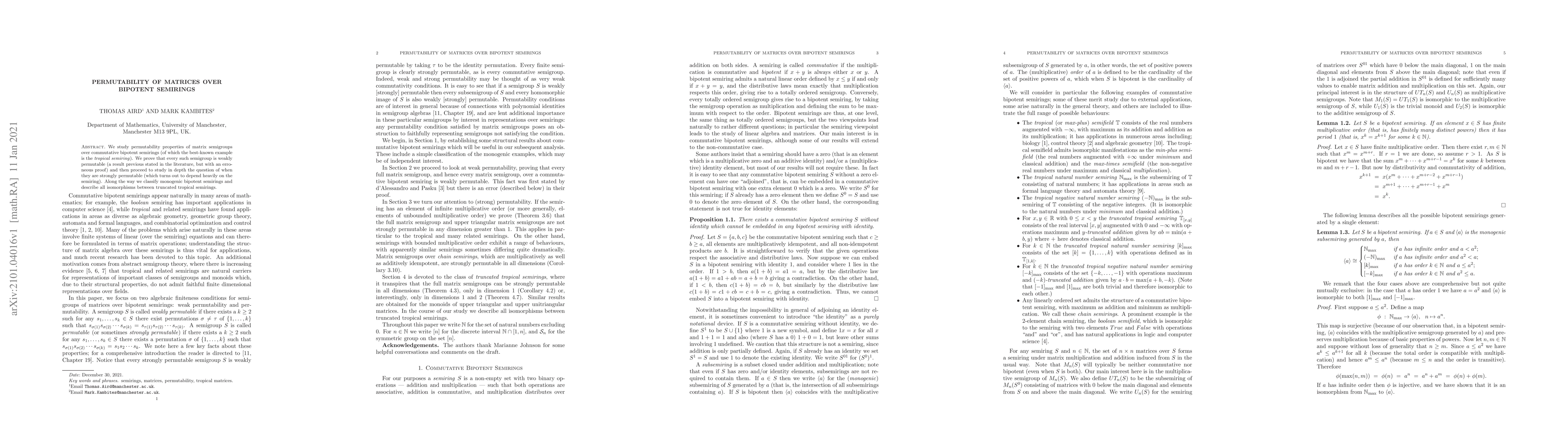 This paper investigates the permutability properties of matrix semigroups over commutative bipotent semirings, proving that they are weakly permutable and exploring conditions for strong permutability, which varies with the semiring. It also classifies monogenic bipotent semirings and details all isomorphisms between truncated tropical semirings.