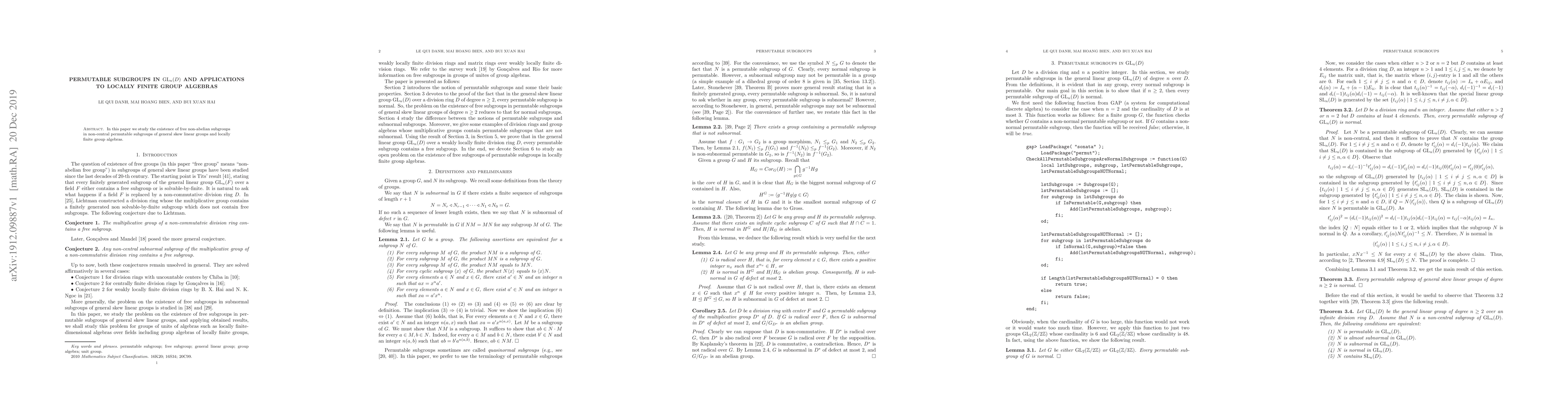 Summary: This paper investigates free non-abelian subgroups within non-central permutable subgroups of general skew linear groups and explores their implications for locally finite group algebras.