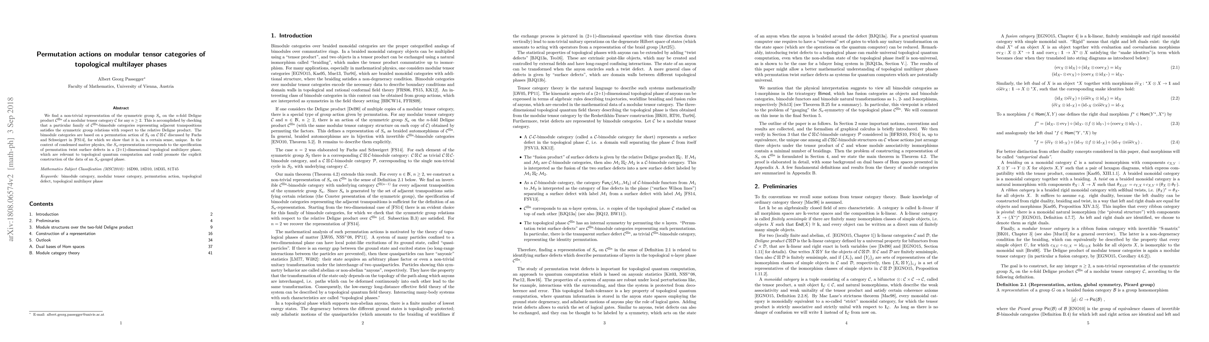 We find a non-trivial representation of the symmetric group $S_n$ on the $n$-fold Deligne product $\mathcal{C}^{\boxtimes n}$ of a modular tensor category $\mathcal{C}$ for any $n \geq 2$. This is accomplished by checking that a particular family of $\mathcal{C}^{\boxtimes n}$-bimodule categories representing adjacent transpositions satisfies the symmetric group relations with respect to the relative Deligne product. The bimodule categories are based on a permutation action of $S_2$ on $\mathcal{C}\boxtimes\mathcal{C}$ discussed by Fuchs and Schweigert in hep-th/1310.1329 , for which we show that it is, in a certain sense, unique. In the context of condensed matter physics, the $S_n$-representation corresponds to the specification of permutation twist surface defects in a (2+1)-dimensional topological multilayer phase, which are relevant to topological quantum computation and could promote the explicit construction of the data of an $S_n$-gauged phase.