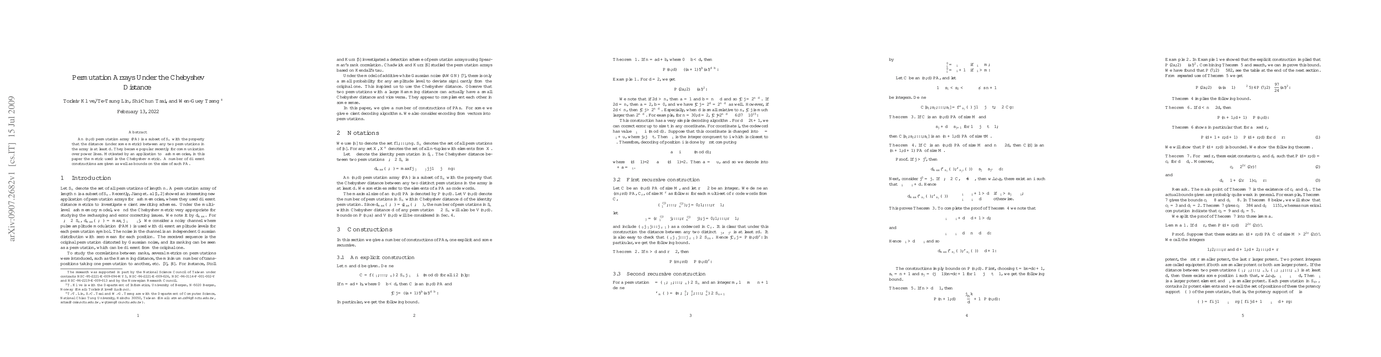 This paper explores (n,d) permutation arrays (PA) under the Chebyshev metric, providing various constructions and size bounds, motivated by applications in flash memory communication. The focus is on ensuring a minimum Chebyshev distance between any two permutations in the array.