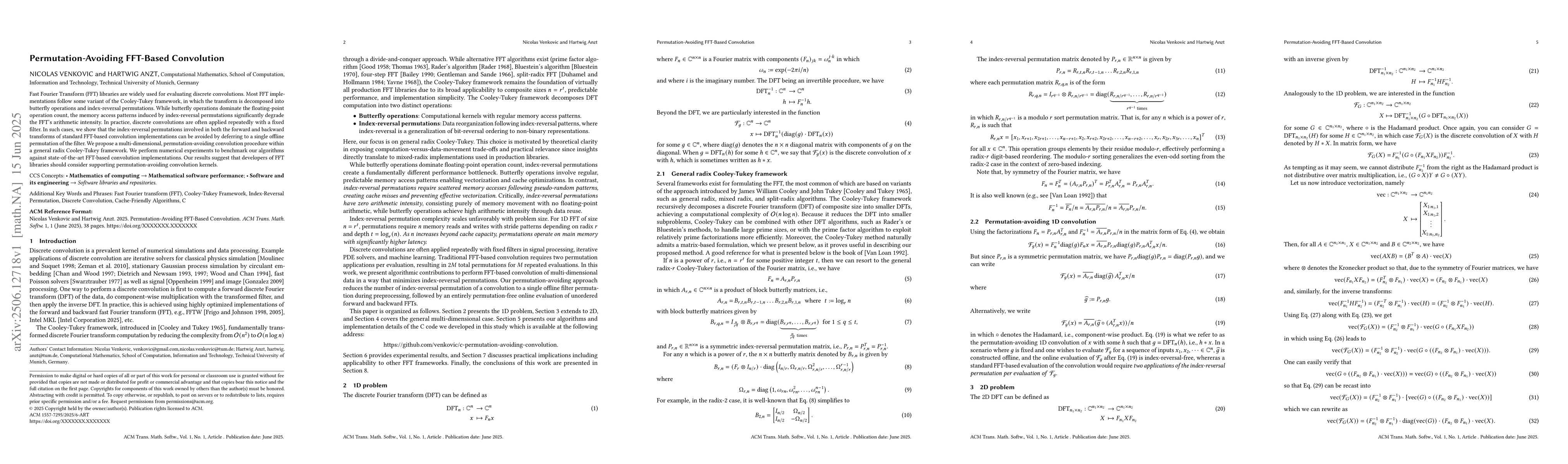 Fast Fourier Transform (FFT) libraries are widely used for evaluating discrete convolutions. Most FFT implementations follow some variant of the Cooley-Tukey framework, in which the transform is decomposed into butterfly operations and index-reversal permutations. While butterfly operations dominate the floating-point operation count, the memory access patterns induced by index-reversal permutations significantly degrade the FFT's arithmetic intensity. In practice, discrete convolutions are often applied repeatedly with a fixed filter. In such cases, we show that the index-reversal permutations involved in both the forward and backward transforms of standard FFT-based convolution implementations can be avoided by deferring to a single offline permutation of the filter. We propose a multi-dimensional, permutation-avoiding convolution procedure within a general radix Cooley-Tukey framework. We perform numerical experiments to benchmark our algorithms against state-of-the-art FFT-based convolution implementations. Our results suggest that developers of FFT libraries should consider supporting permutation-avoiding convolution kernels.