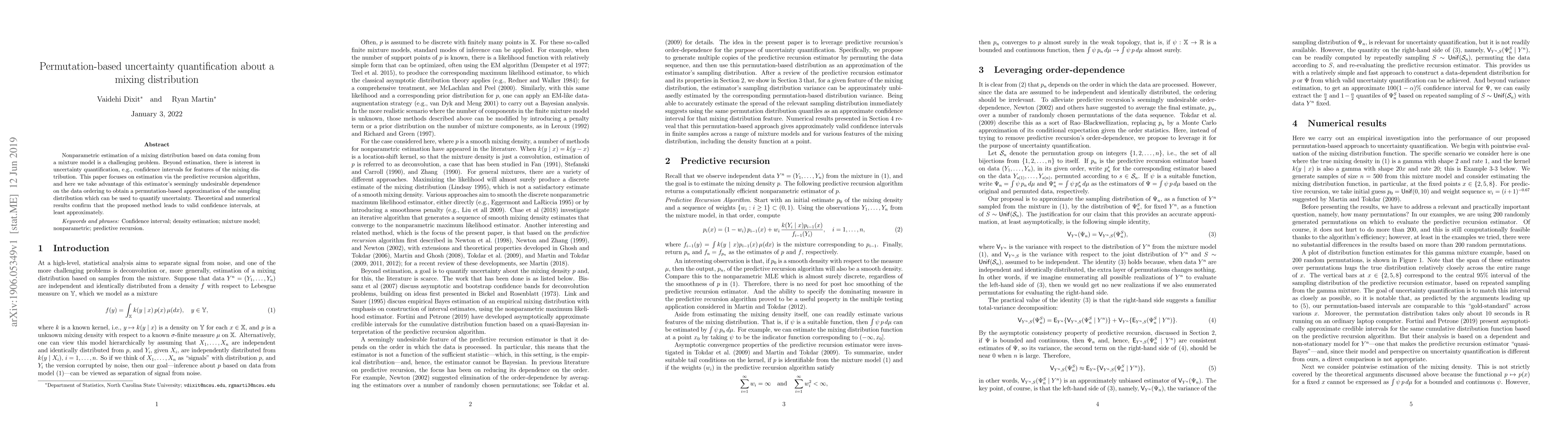 This paper proposes a permutation-based method for uncertainty quantification in nonparametric estimation of a mixing distribution from mixture models. It leverages the predictive recursion algorithm's dependence on data ordering to approximate the sampling distribution, yielding valid confidence intervals.