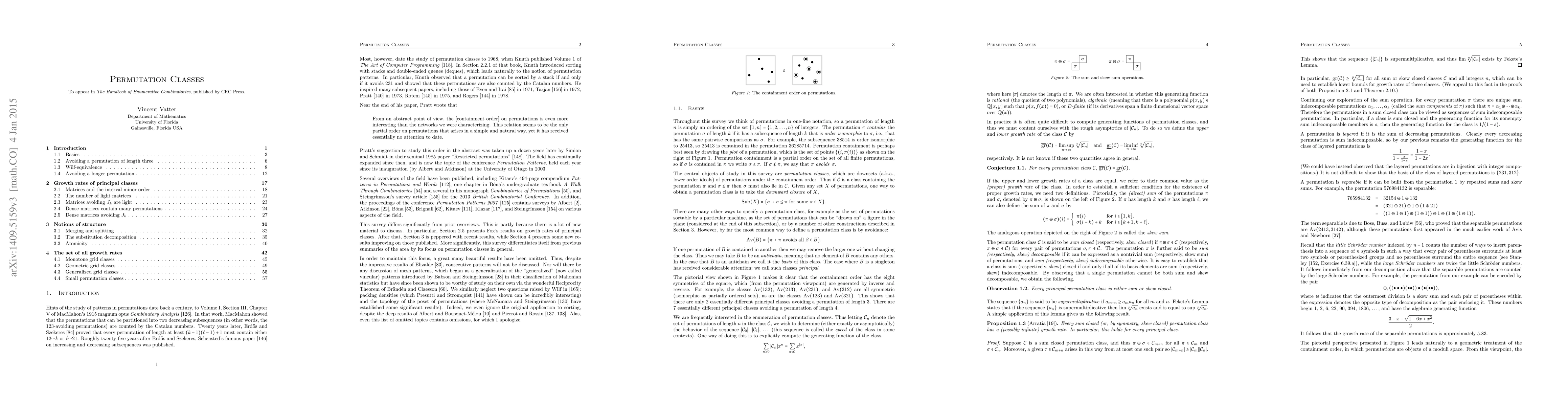 Summary: This paper provides a comprehensive survey of permutation classes, focusing on their structure, properties, and classification. It aims to contribute to the Handbook of Enumerative Combinatorics by detailing the current state of research in this area.