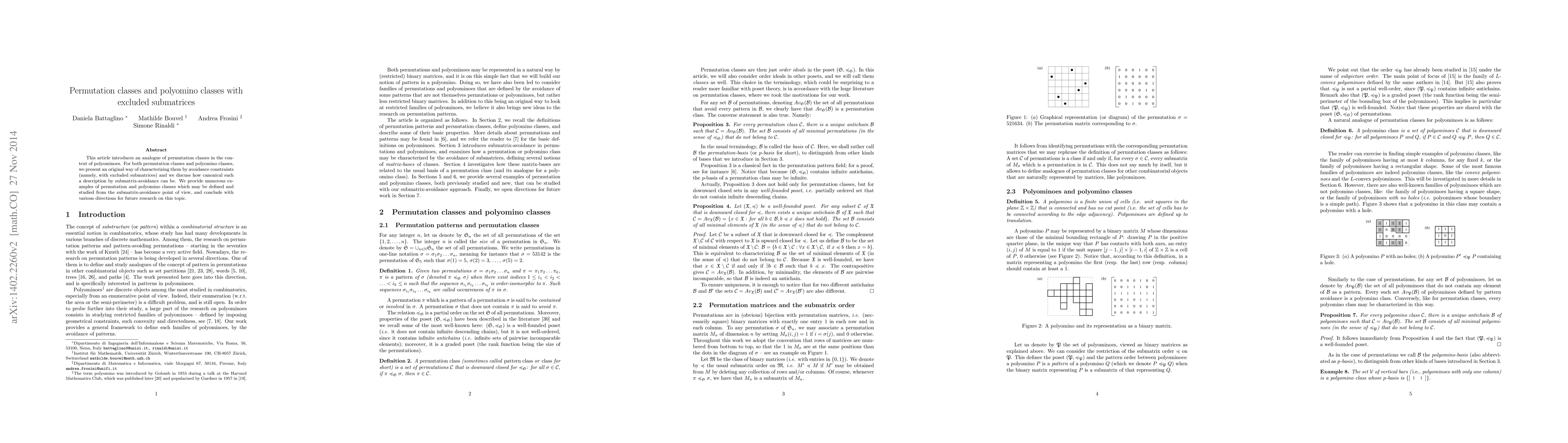 This paper explores permutation classes and polyomino classes through the lens of submatrix avoidance, presenting a new characterization method and providing examples. Future research directions are proposed to further investigate these submatrix-avoidance definitions.