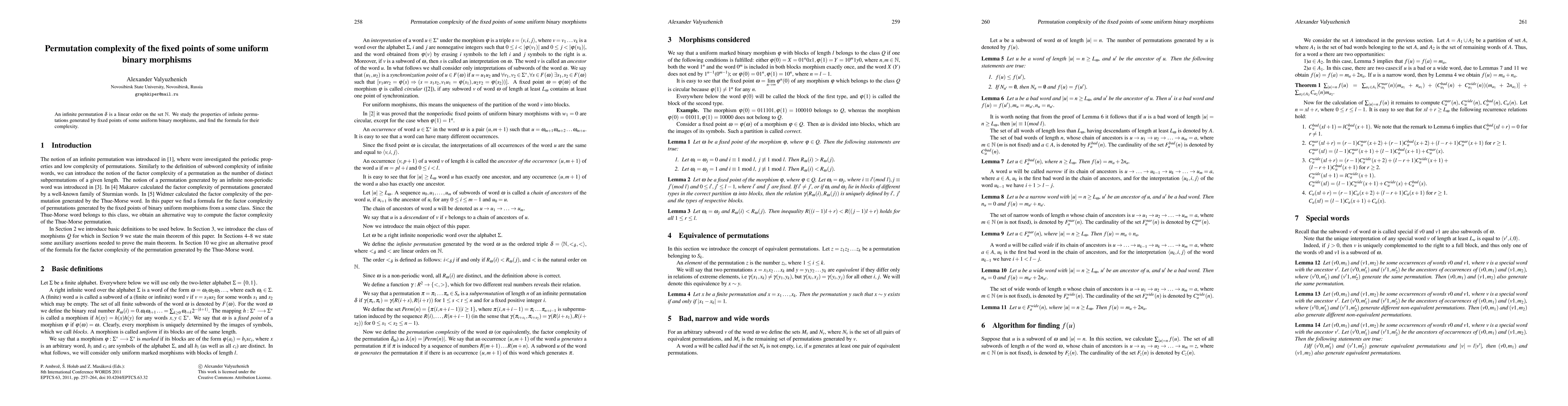 Summary: This paper investigates the properties of infinite permutations derived from fixed points of specific uniform binary morphisms, and establishes a formula for the complexity of these permutations.
