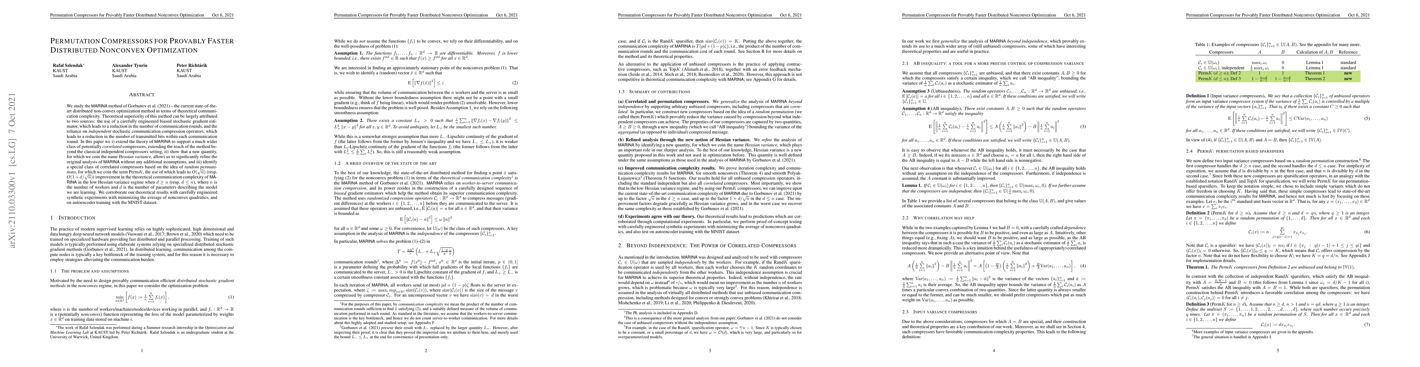 We study the MARINA method of Gorbunov et al (2021) -- the current state-of-the-art distributed non-convex optimization method in terms of theoretical communication complexity. Theoretical superiority of this method can be largely attributed to two sources: the use of a carefully engineered biased stochastic gradient estimator, which leads to a reduction in the number of communication rounds, and the reliance on {\em independent} stochastic communication compression operators, which leads to a reduction in the number of transmitted bits within each communication round. In this paper we i) extend the theory of MARINA to support a much wider class of potentially {\em correlated} compressors, extending the reach of the method beyond the classical independent compressors setting, ii) show that a new quantity, for which we coin the name {\em Hessian variance}, allows us to significantly refine the original analysis of MARINA without any additional assumptions, and iii) identify a special class of correlated compressors based on the idea of {\em random permutations}, for which we coin the term Perm$K$, the use of which leads to $O(\sqrt{n})$ (resp. $O(1 + d/\sqrt{n})$) improvement in the theoretical communication complexity of MARINA in the low Hessian variance regime when $d\geq n$ (resp. $d \leq n$), where $n$ is the number of workers and $d$ is the number of parameters describing the model we are learning. We corroborate our theoretical results with carefully engineered synthetic experiments with minimizing the average of nonconvex quadratics, and on autoencoder training with the MNIST dataset.