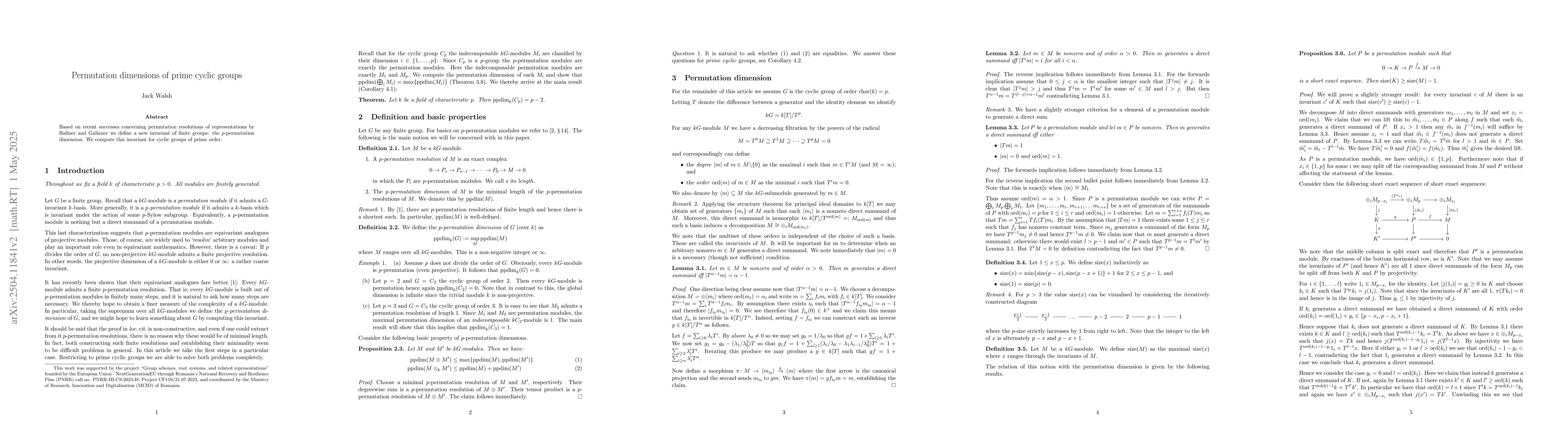 The definition and computation of p-permutation dimensions for finite groups, particularly cyclic groups of prime order, provide a new invariant in module theory.