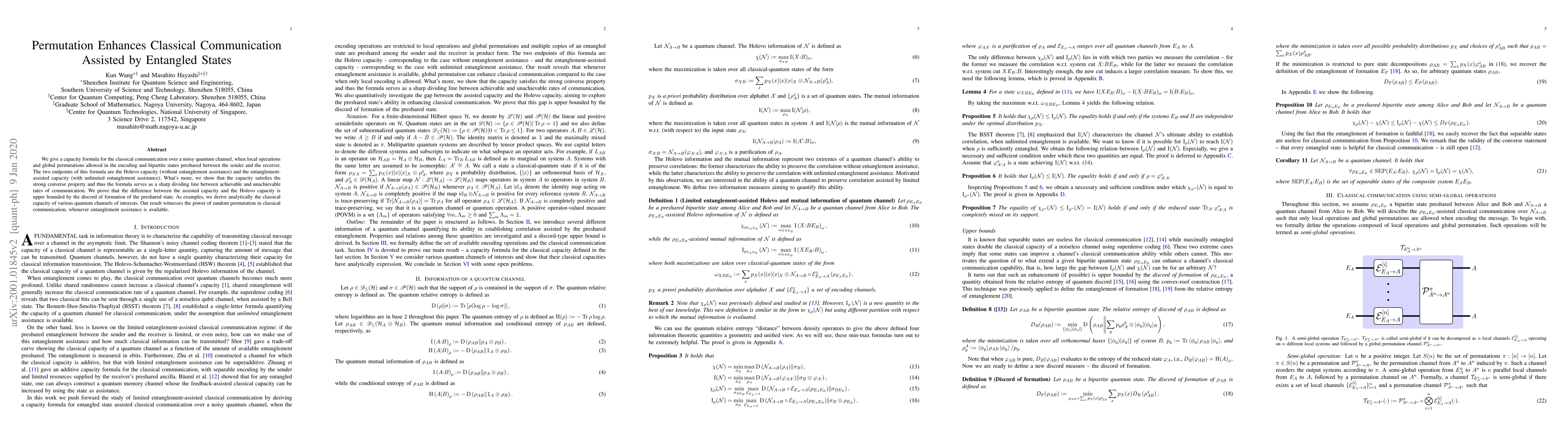 This paper presents a capacity formula for classical communication over noisy quantum channels, allowing local operations and global permutations with preshared entangled states. It establishes a sharp dividing line between achievable and unachievable communication rates, demonstrating the strong converse property and showing the upper bound of the difference between assisted and Holevo capacities by the discord of the preshared state.