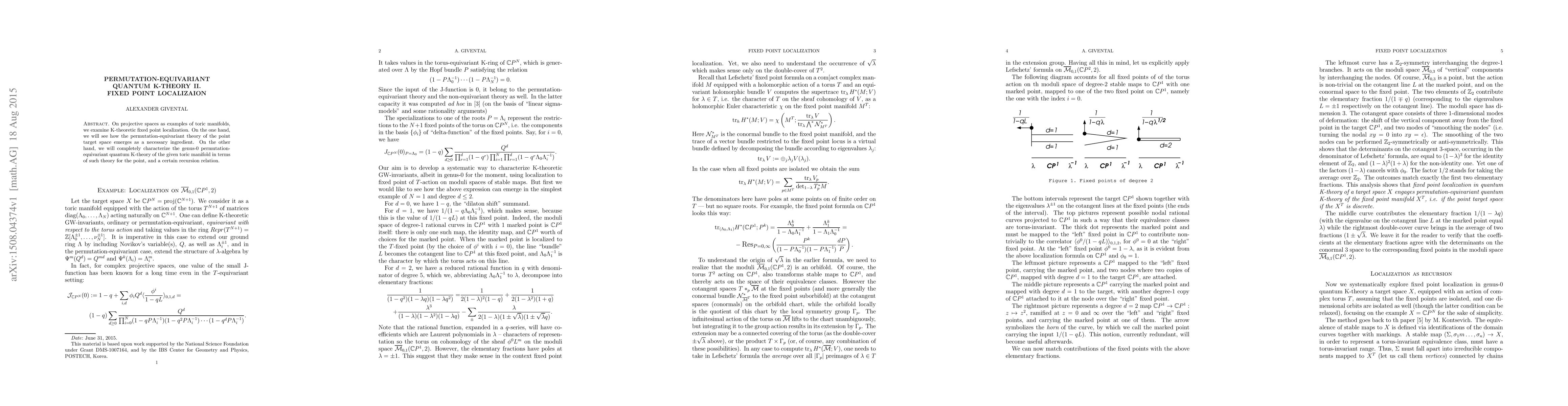 This paper explores K-theoretic fixed point localization on toric manifolds, demonstrating how permutation-equivariant quantum K-theory at the point target space is essential. It fully characterizes the genus-0 theory for these manifolds using recursion relations.