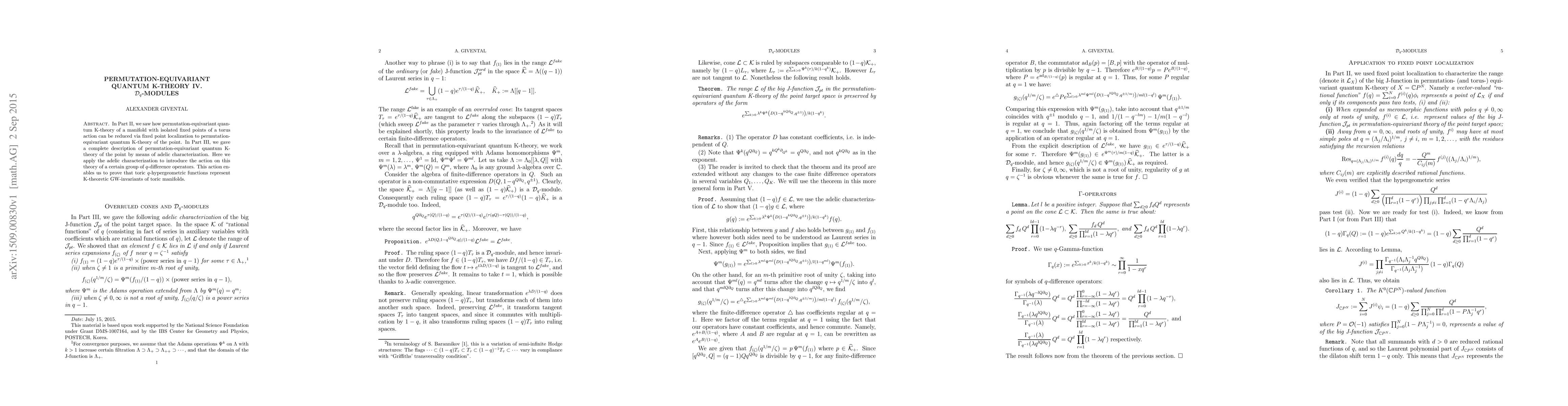 In Part II, we saw how genus-0 permutation-equivariant quantum K-theory of a manifold with isolated fixed points of a torus action can be reduced via fixed point localization to permutation-equivariant quantum K-theory of the point. In Part III, we gave a complete description of genus-0 permutation-equivariant quantum K-theory of the point by means of adelic characterization. Here we apply the adelic characterization to introduce the action on this theory of a certain group of $q$-difference operators. This action will enable us to prove that toric $q$-hypergeometric functions represent K-theoretic GW-invariants of toric manifolds.
