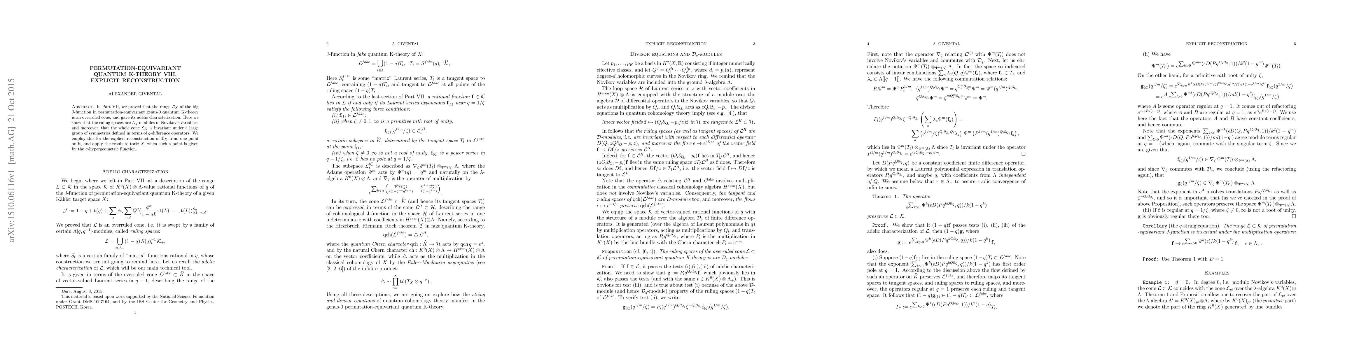In Part VII, we proved that the range of the big J-function in permutation-equivariant genus-0 quantum K-theory is an overruled cone, and gave its adelic characterization. Here we show that the ruling spaces are D_q-modules in Novikov's variables, and moreover, that the whole cone is invariant under a large group of symmetries defined in terms of q-difference operators. We employ this for the explicit reconstruction of the cone from one point on it, and apply the result to toric target spaces, when such a point is given by the q-hypergeometric function.