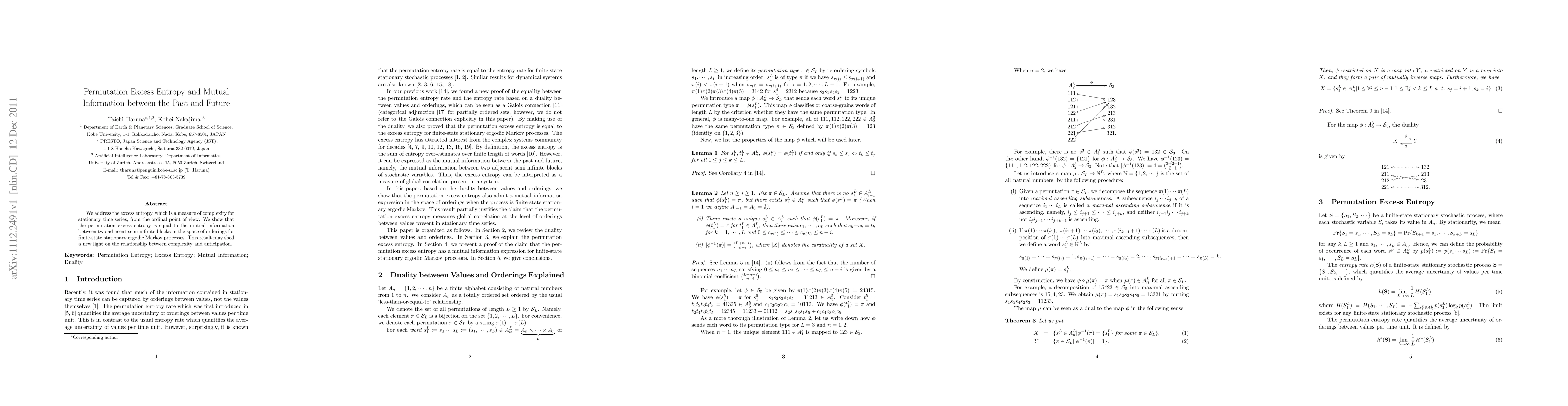 This paper establishes that permutation excess entropy equals mutual information between adjacent semi-infinite blocks in finite-state stationary ergodic Markov processes, offering new insights into the complexity and anticipation relationship.