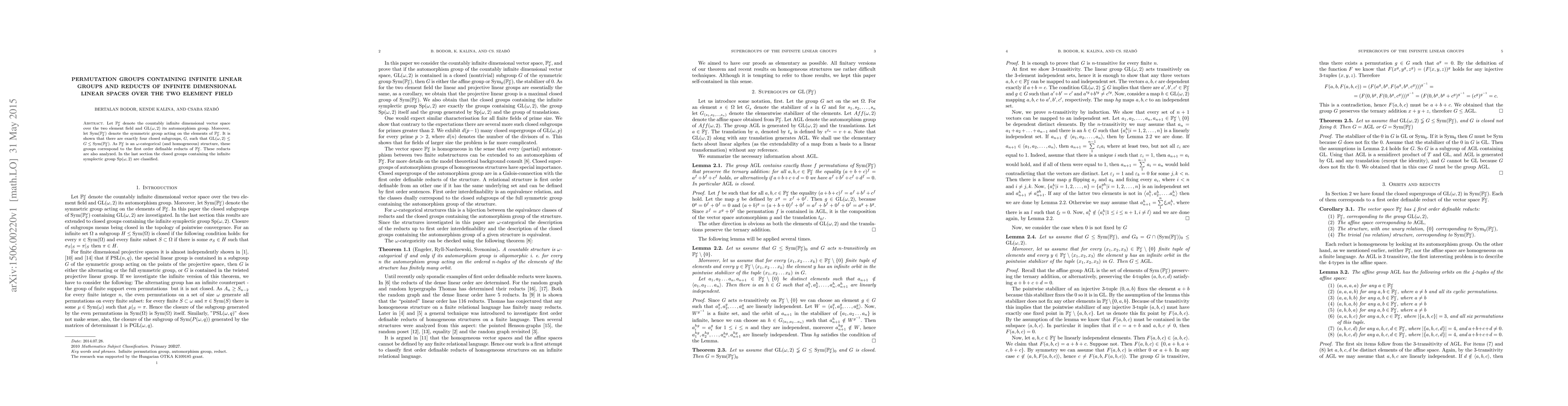 This paper identifies four closed subgroups between the infinite linear group $\operatorname{GL}(\omega, 2)$ and the symmetric group $\operatorname{Sym}(\mathbb{F}_2^\omega)$, corresponding to first-order definable reducts of the countably infinite dimensional vector space $\mathbb{F}_2^\omega$. It also classifies the closed groups containing the infinite symplectic group $\operatorname{Sp}(\omega, 2)$.