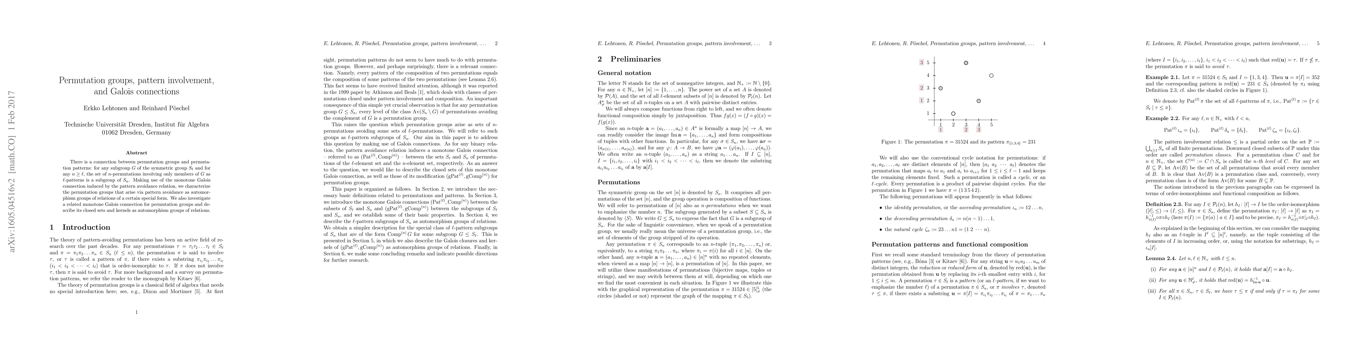This paper explores the relationship between permutation groups and permutation patterns, demonstrating that certain permutation groups arise as automorphism groups of specific relations through a Galois connection. It characterizes these groups using pattern avoidance and investigates the structure of related Galois connections.