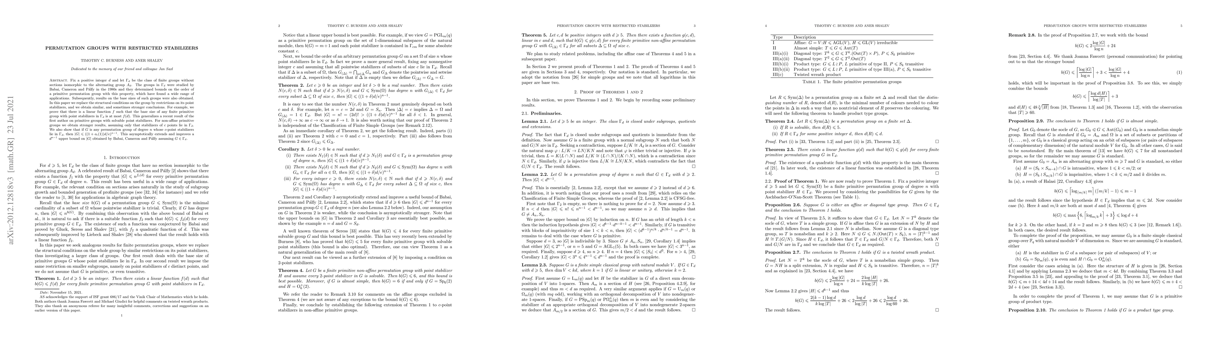 Fix a positive integer $d$ and let $\Gamma_d$ be the class of finite groups without sections isomorphic to the alternating group $A_d$. The groups in $\Gamma_d$ were studied by Babai, Cameron and P\'{a}lfy in the 1980s and they determined bounds on the order of a primitive permutation group with this property, which have found a wide range of applications. Subsequently, results on the base sizes of such groups were also obtained. In this paper we replace the structural conditions on the group by restrictions on its point stabilizers, and we obtain similar, and sometimes stronger conclusions. For example, we prove that there is a linear function $f$ such that the base size of any finite primitive group with point stabilizers in $\Gamma_d$ is at most $f(d)$. This generalizes a recent result of the first author on primitive groups with solvable point stabilizers. For non-affine primitive groups we obtain stronger results, assuming only that stabilizers of $c$ points lie in $\Gamma_d$. We also show that if $G$ is any permutation group of degree $n$ whose $c$-point stabilizers lie in $\Gamma_d$, then $|G| \leqslant ((1+o_c(1))d/e)^{n-1}$. This asymptotically extends and improves a $d^{n-1}$ upper bound on $|G|$ obtained by Babai, Cameron and P\'{a}lfy assuming $G \in \Gamma_d$.