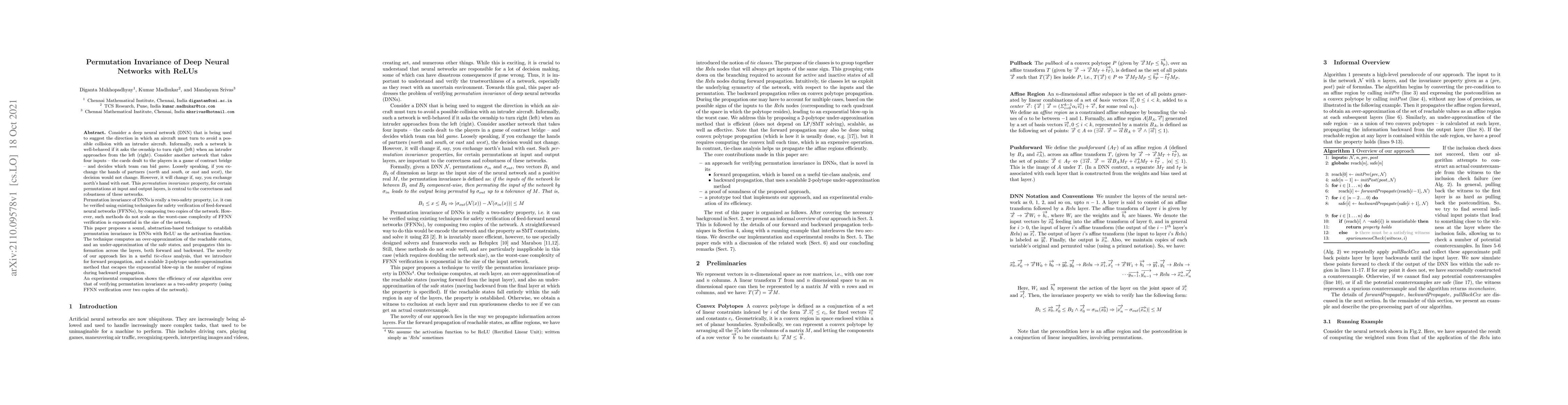 This paper proposes a method to establish permutation invariance in deep neural networks with ReLU activation functions, enabling their use in critical applications like collision avoidance and game decision-making.