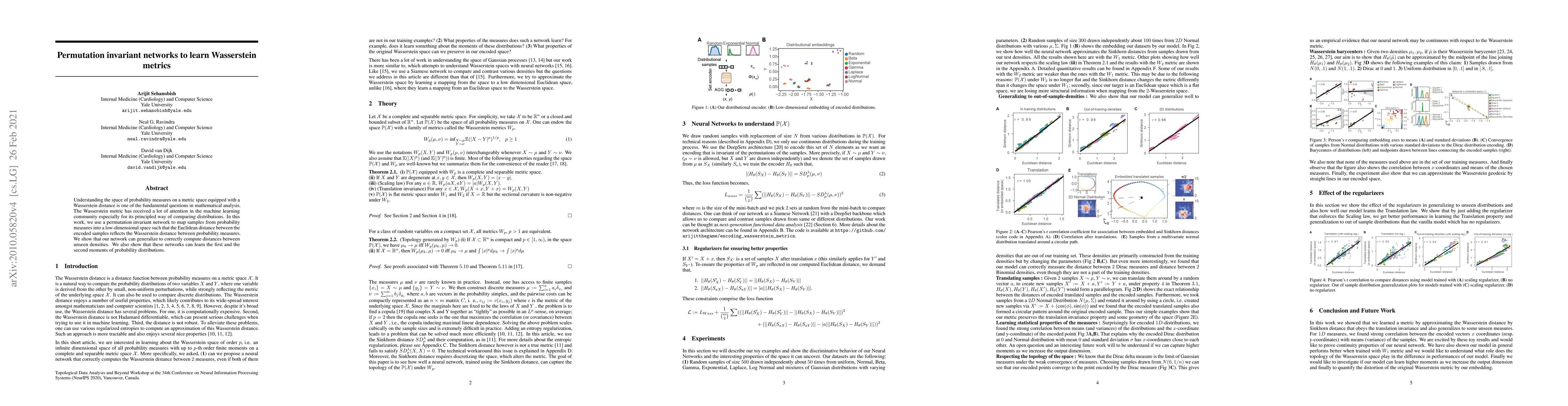Understanding the space of probability measures on a metric space equipped with a Wasserstein distance is one of the fundamental questions in mathematical analysis. The Wasserstein metric has received a lot of attention in the machine learning community especially for its principled way of comparing distributions. In this work, we use a permutation invariant network to map samples from probability measures into a low-dimensional space such that the Euclidean distance between the encoded samples reflects the Wasserstein distance between probability measures. We show that our network can generalize to correctly compute distances between unseen densities. We also show that these networks can learn the first and the second moments of probability distributions.