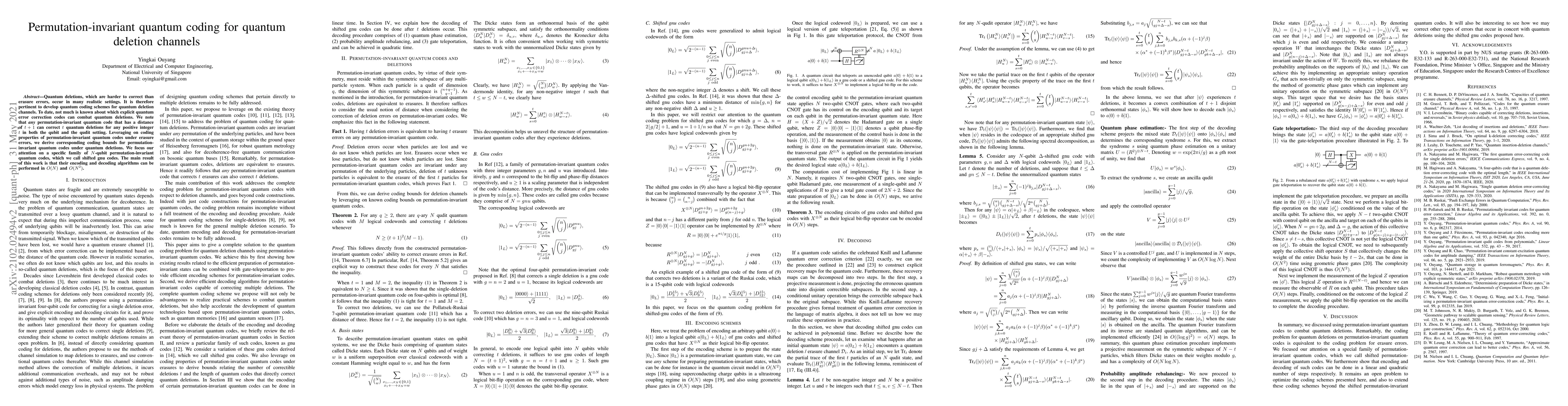 This paper develops quantum coding schemes for correcting quantum deletions, focusing on permutation-invariant quantum codes with a distance of $t+1$ that can correct $t$ deletions. It introduces shifted gnu codes, demonstrating efficient $O(N)$ encoding and $O(N^2)$ decoding algorithms.
