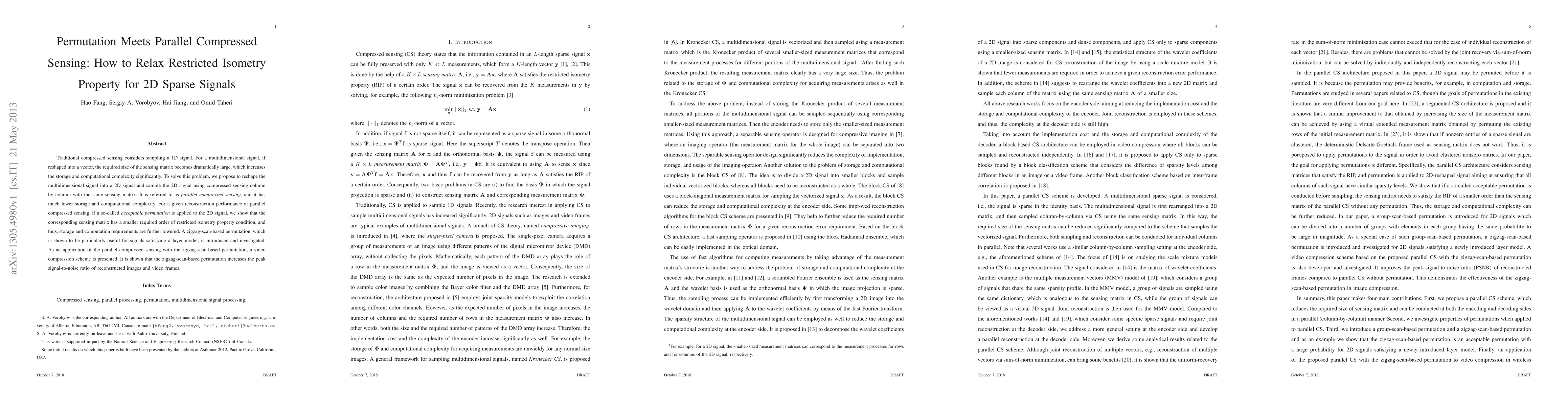 Traditional compressed sensing considers sampling a 1D signal. For a multidimensional signal, if reshaped into a vector, the required size of the sensing matrix becomes dramatically large, which increases the storage and computational complexity significantly. To solve this problem, we propose to reshape the multidimensional signal into a 2D signal and sample the 2D signal using compressed sensing column by column with the same sensing matrix. It is referred to as parallel compressed sensing, and it has much lower storage and computational complexity. For a given reconstruction performance of parallel compressed sensing, if a so-called acceptable permutation is applied to the 2D signal, we show that the corresponding sensing matrix has a smaller required order of restricted isometry property condition, and thus, storage and computation requirements are further lowered. A zigzag-scan-based permutation, which is shown to be particularly useful for signals satisfying a layer model, is introduced and investigated. As an application of the parallel compressed sensing with the zigzag-scan-based permutation, a video compression scheme is presented. It is shown that the zigzag-scan-based permutation increases the peak signal-to-noise ratio of reconstructed images and video frames.