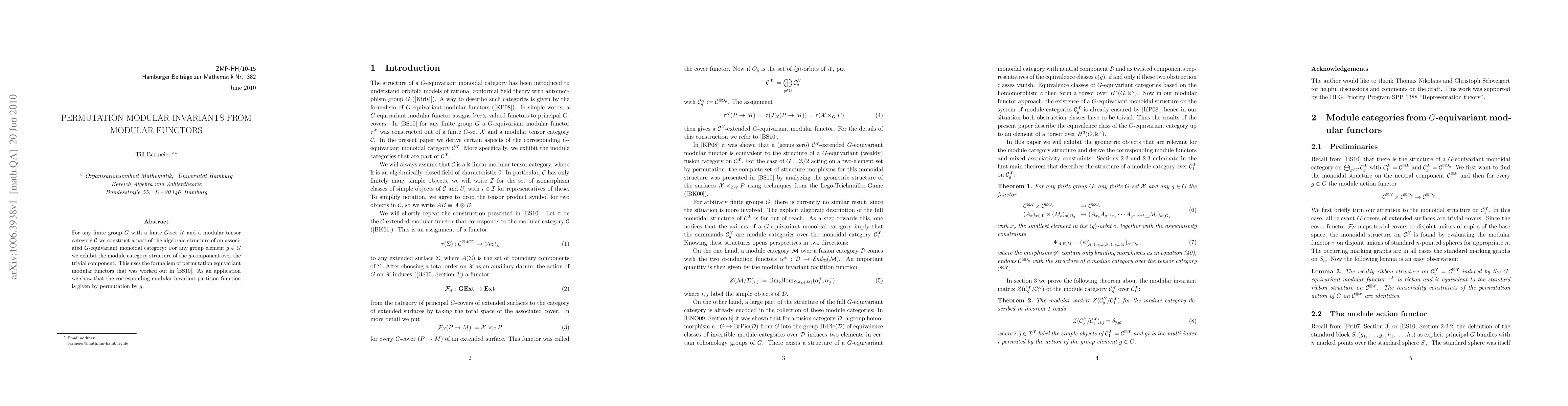 This paper constructs module category structures for G-equivariant monoidal categories using permutation modular functors, demonstrating that the resulting modular invariant partition function permutes by group elements. The formalism builds on previous work outlined in arXiv:1004.1825.