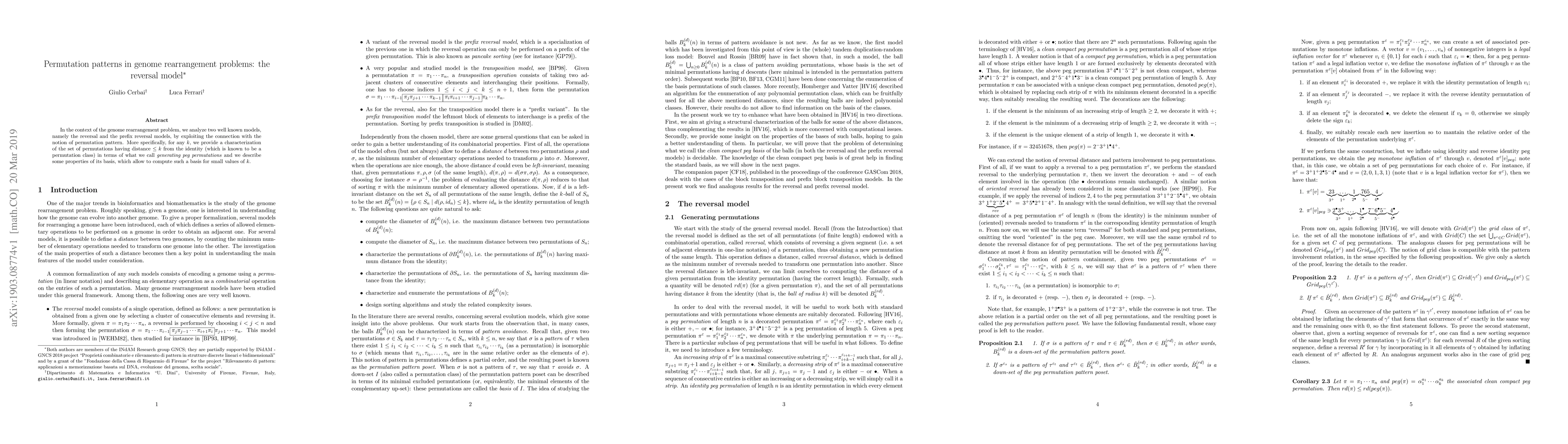 In the context of the genome rearrangement problem, we analyze two well known models, namely the reversal and the prefix reversal models, by exploiting the connection with the notion of permutation pattern. More specifically, for any $k$, we provide a characterization of the set of permutations having distance $\leq k$ from the identity (which is known to be a permutation class) in terms of what we call generating peg permutations and we describe some properties of its basis, which allow to compute such a basis for small values of $k$.