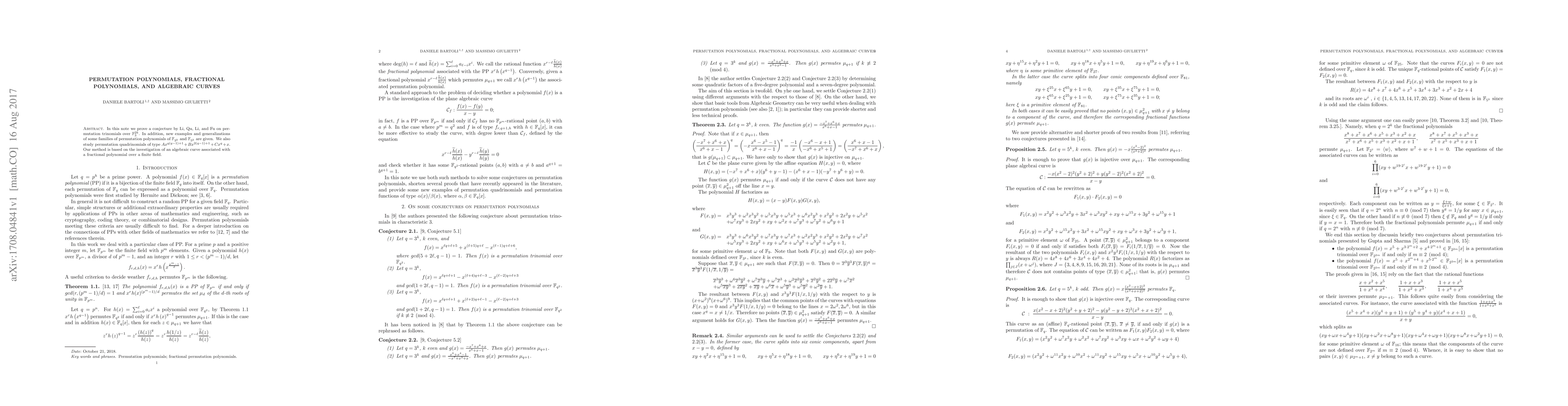 In this note we prove a conjecture by Li, Qu, Li, and Fu on permutation trinomials over $\mathbb{F}_3^{2k}$. In addition, new examples and generalizations of some families of permutation polynomials of $\mathbb{F}_{3^k}$ and $\mathbb{F}_{5^k}$ are given. We also study permutation quadrinomials of type $Ax^{q(q-1)+1} + Bx^{2(q-1)+1} + Cx^{q} + x$. Our method is based on the investigation of an algebraic curve associated with a {fractional polynomial} over a finite field.