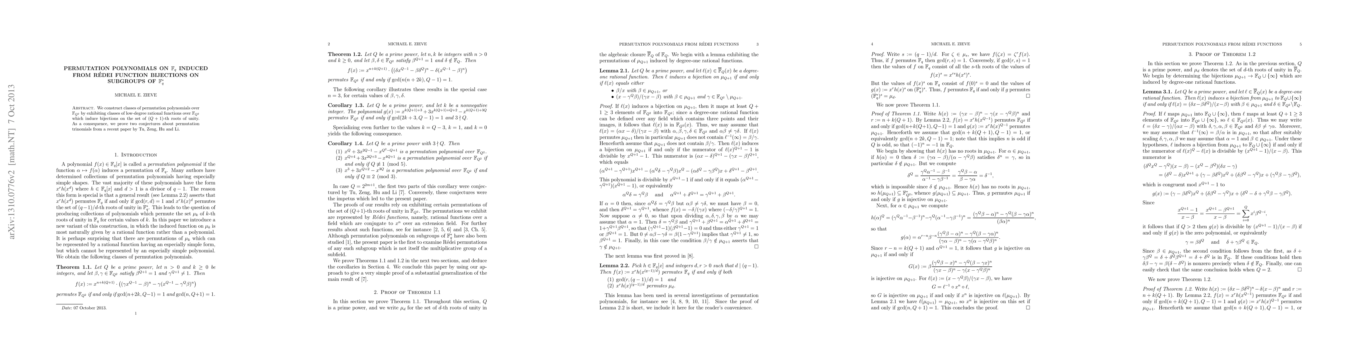 We construct classes of permutation polynomials over F_{Q^2} by exhibiting classes of low-degree rational functions over F_{Q^2} which induce bijections on the set of (Q+1)-th roots of unity in F_{Q^2}. As a consequence, we prove two conjectures about permutation trinomials from a recent paper by Tu, Zeng, Hu and Li.