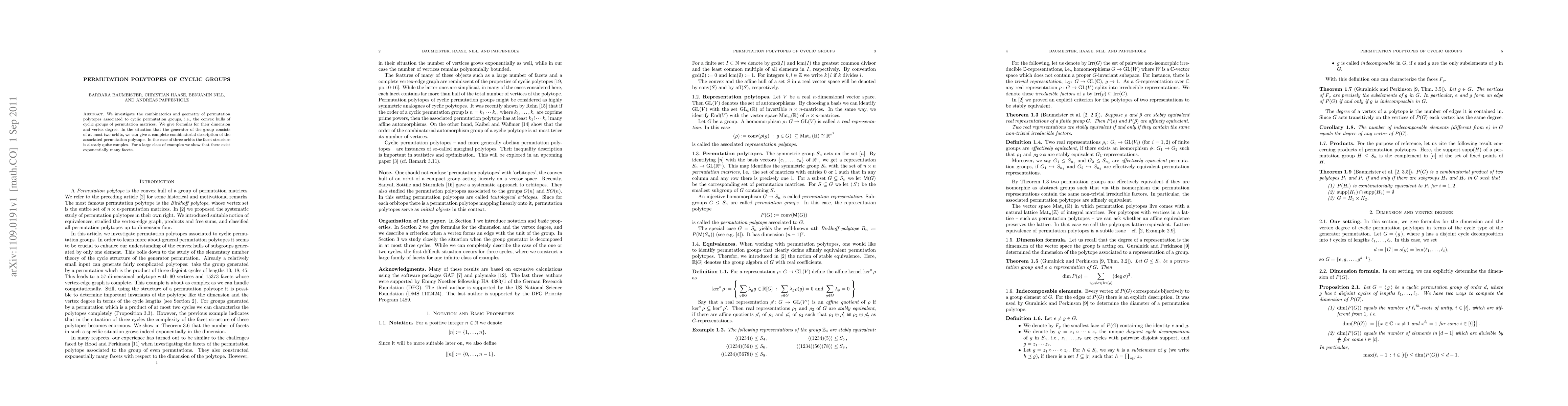 This paper explores the combinatorics and geometry of permutation polytopes linked to cyclic permutation groups, providing formulas for their dimension and vertex degree. It offers a complete combinatorial description for groups with up to two orbits, while highlighting the complexity and exponential facet count in cases with three orbits.