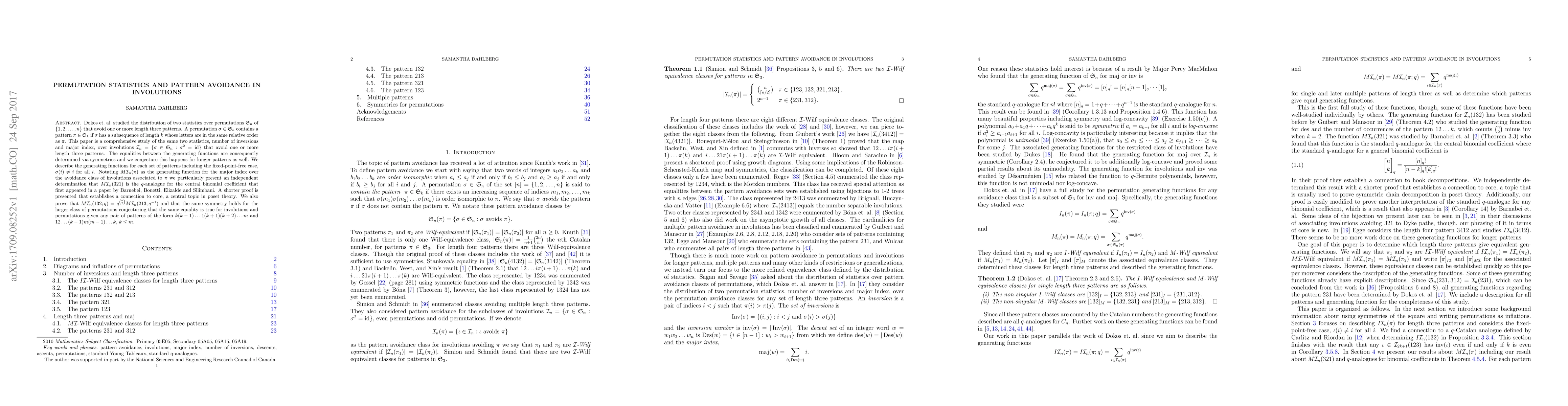 Dokos et al. investigate permutation statistics on involutions that avoid certain length three patterns, determining the generating functions for these statistics and proving symmetries. They notably show that $M\mathcal{I}_n(321)$ is the $q$-analogue of the central binomial coefficient and conjecture similar symmetries for longer patterns.