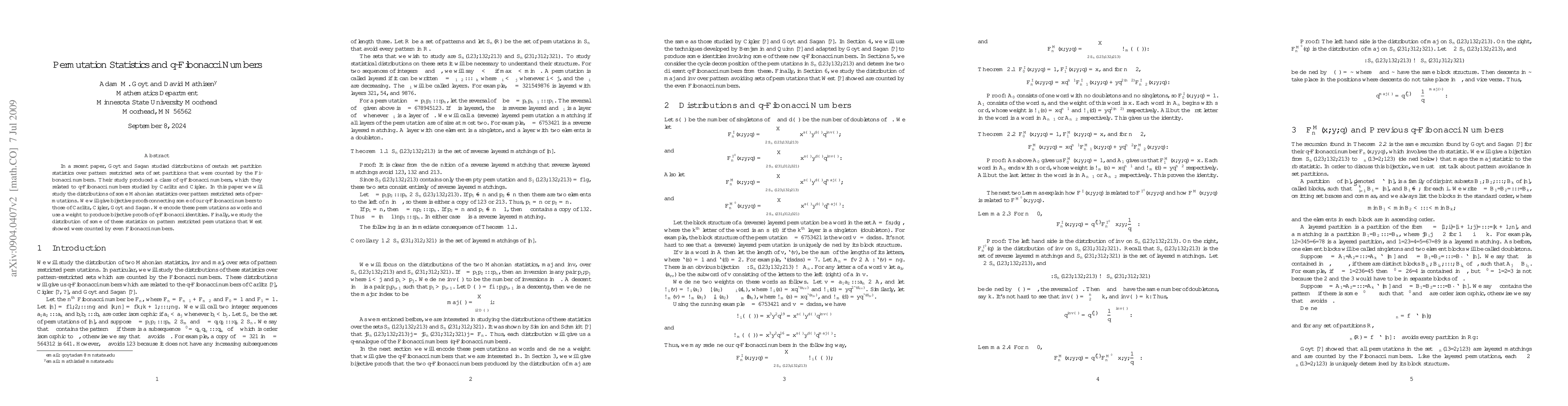 In a recent paper, Goyt and Sagan studied distributions of certain set partition statistics over pattern restricted sets of set partitions that were counted by the Fibonacci numbers. Their study produced a class of $q$-Fibonacci numbers, which they related to $q$-Fibonacci numbers studied by Carlitz and Cigler. In this paper we will study the distributions of some Mahonian statistics over pattern restricted sets of permutations. We will give bijective proofs connecting some of our $q$-Fibonacci numbers to those of Carlitz, Cigler, Goyt and Sagan. We encode these permutations as words and use a weight to produce bijective proofs of $q$-Fibonacci identities. Finally, we study the distribution of some of these statistics on pattern restricted permutations that West showed were counted by even Fibonacci numbers.