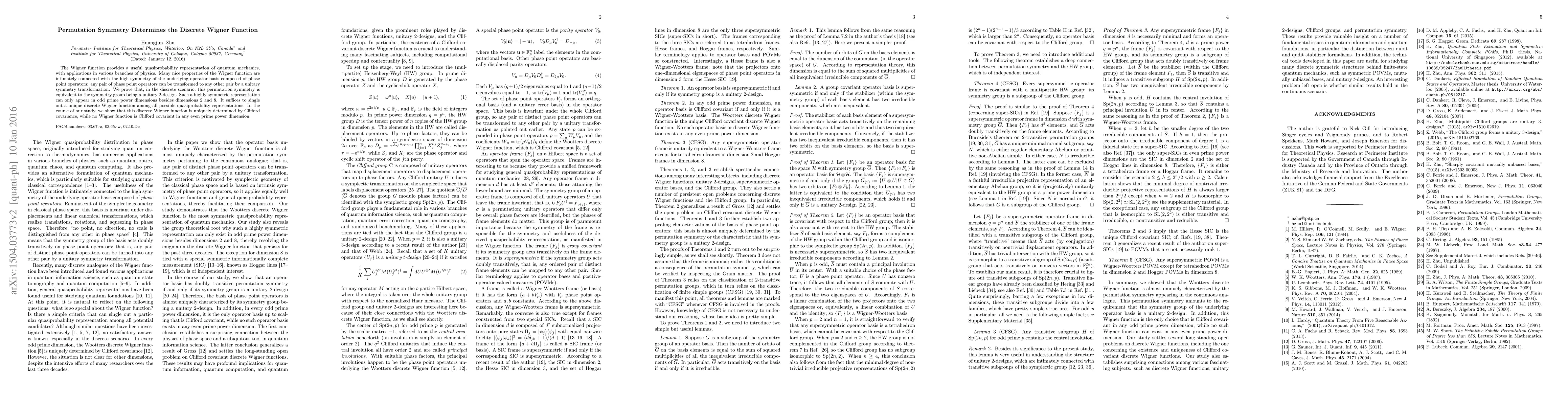The paper proves that permutation symmetry in the discrete Wigner function is equivalent to the symmetry group being a unitary 2-design, which uniquely determines a discrete Wigner function in odd prime power dimensions and dimensions 2 and 8. It also shows that this function is uniquely determined by Clifford covariance, with no such covariant Wigner function in even prime power dimensions.