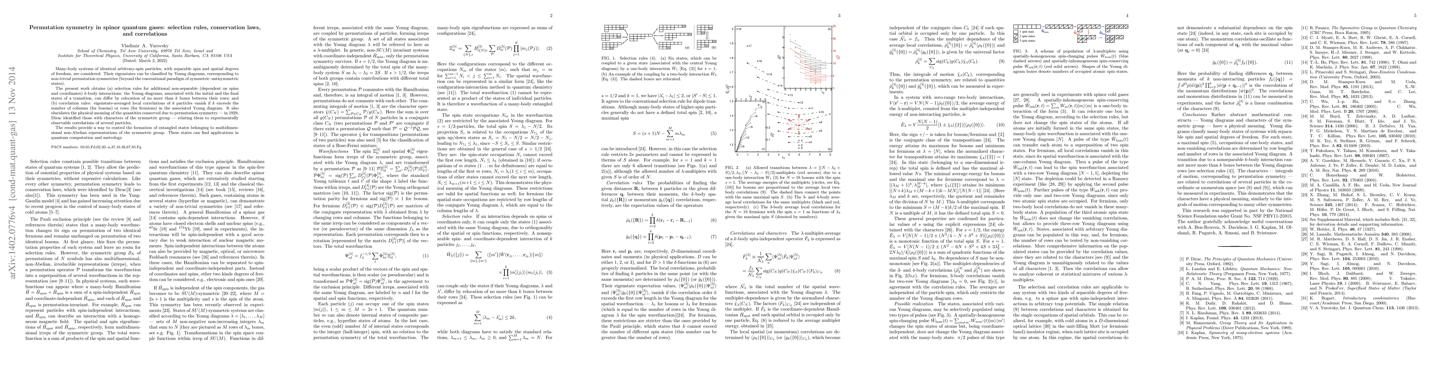 Many-body systems of identical arbitrary-spin particles, with separable spin and spatial degrees of freedom, are considered. Their eigenstates can be classified by Young diagrams, corresponding to non-trivial permutation symmetries (beyond the conventional paradigm of symmetric--antisymmetric states). The present work obtains (a) selection rules for additional non-separable (dependent on spins and coordinates) $k$-body interactions: the Young diagrams, associated with the initial and the final states of a transition, can differ by relocation of no more than $k$ boxes between their rows; and (b) correlation rules: eigenstate-averaged local correlations of $k$ particles vanish if $k$ exceeds the number of columns (for bosons) or rows (for fermions) in the associated Young diagram. It also elucidates the physical meaning of the quantities conserved due to permutation symmetry --- in 1929, Dirac identified those with characters of the symmetric group --- relating them to experimentally observable correlations of several particles. The results provide a way to control the formation of entangled states belonging to multidimensional non-Abelian representations of the symmetric group. These states can find applications in quantum computation and metrology.