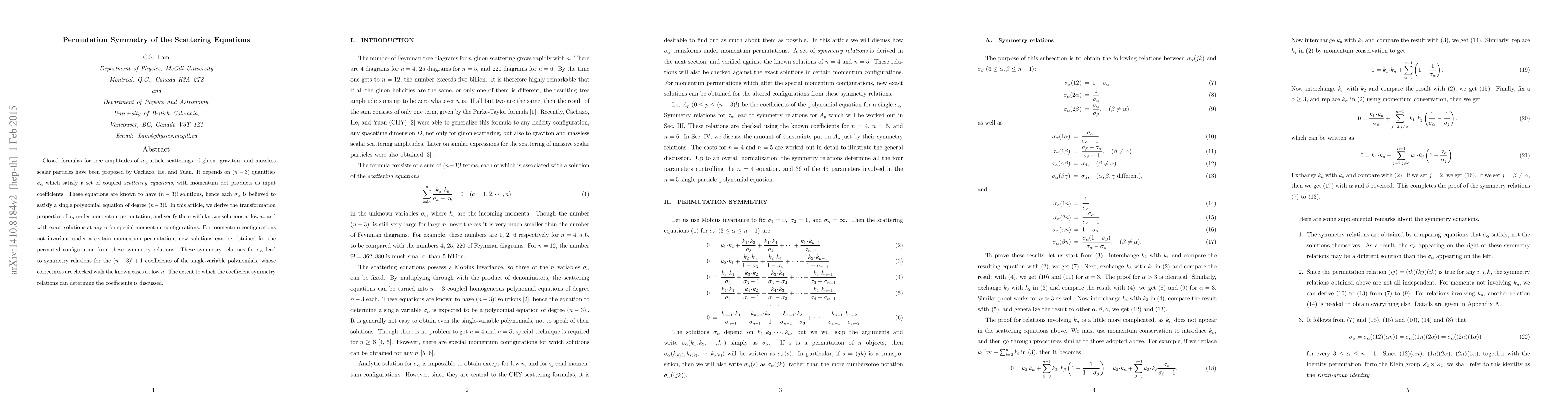 Researchers investigate the symmetry properties of scattering equations for particle interactions, finding new solutions for non-invariant momentum configurations and implications for determining coefficients in polynomial equations.