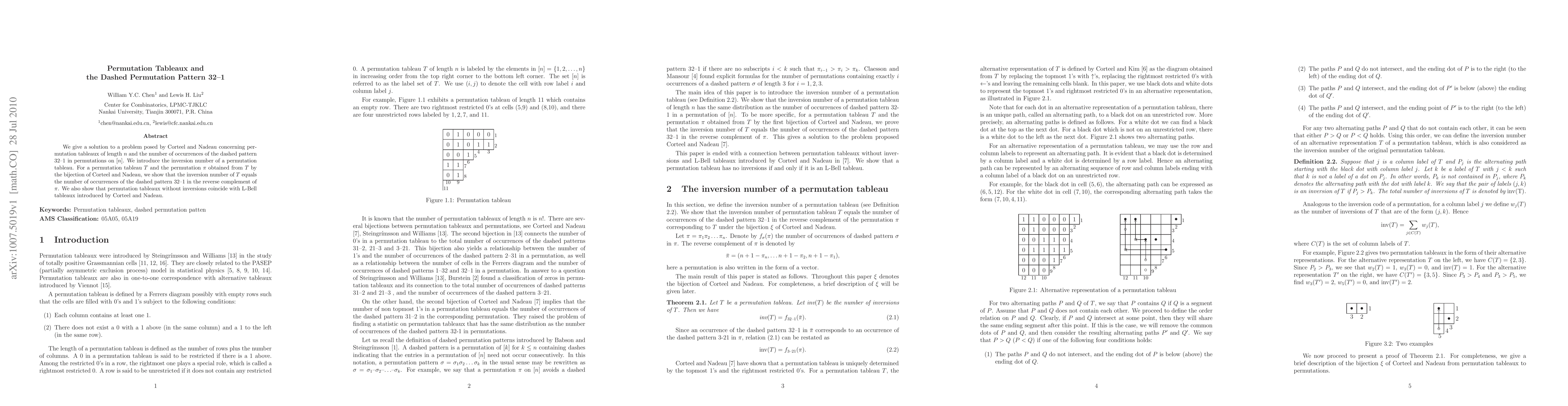 This paper provides a solution to Corteel and Nadeau's problem on permutation tableaux of length n and the occurrence of the dashed permutation pattern 32--1. It introduces the concept of the inversion number of a permutation tableau, proving that this number equals the instances of the pattern in the reverse complement of the corresponding permutation. Additionally, it establishes a connection between permutation tableaux without inversions and L-Bell tableaux.