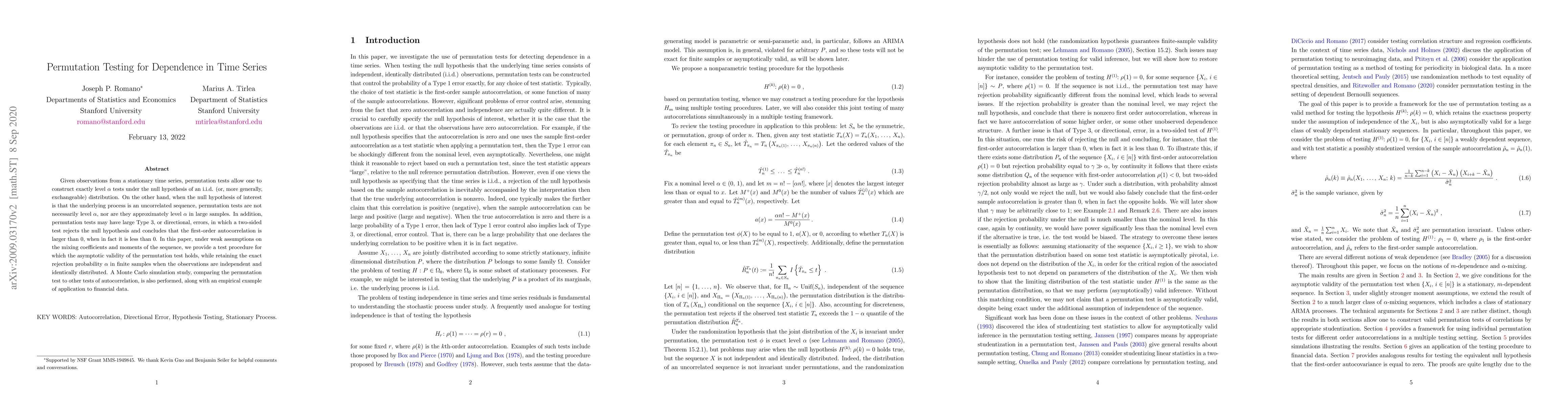 The paper develops a permutation testing framework for dependence in time series, specifically focusing on the first-order autocorrelation. It provides a test procedure ensuring asymptotic validity of the permutation test while maintaining exact rejection probability $\alpha$ in finite samples under the null hypothesis of an i.i.d. distribution.