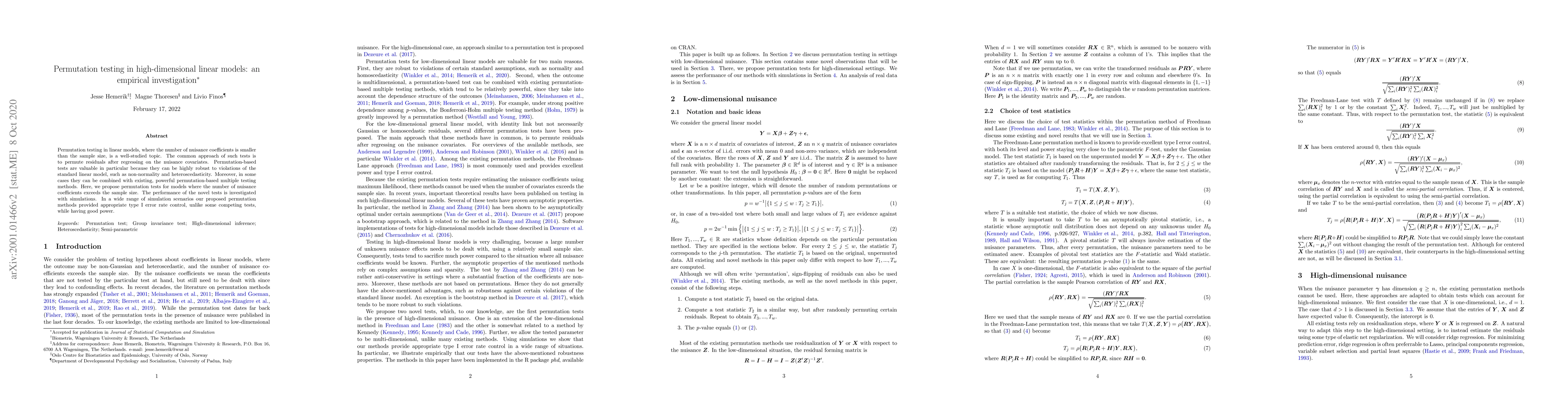 This paper proposes permutation tests for high-dimensional linear models where the number of nuisance coefficients exceeds the sample size. The study finds that the proposed permutation methods effectively control type I error rates and exhibit good power compared to competing tests, as demonstrated through extensive simulations.