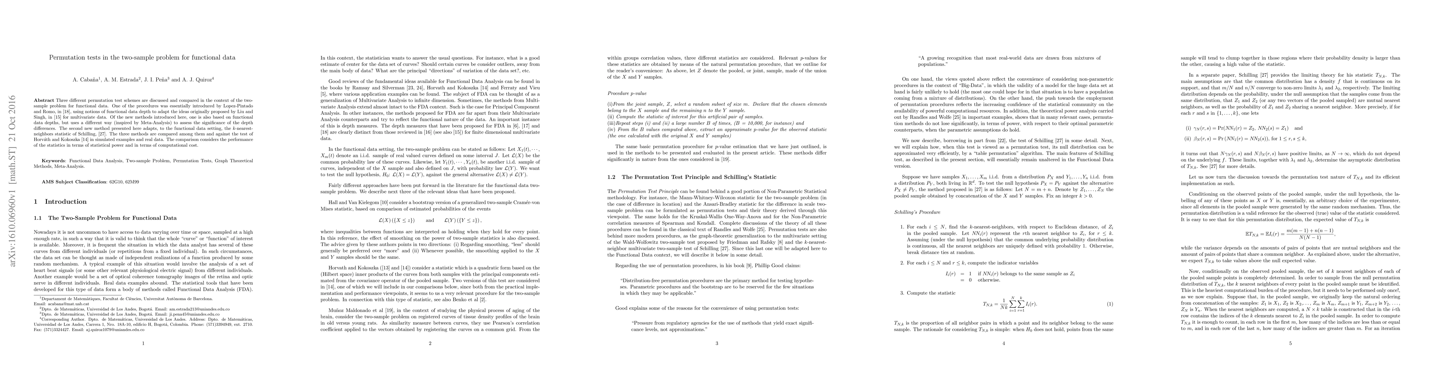 This paper compares three permutation test schemes for the two-sample problem in functional data, including a method adapted from Lopez-Pintado and Romo, a new method inspired by Meta-Analysis, and a k-nearest-neighbors statistic. The performance of these tests is evaluated in terms of statistical power and computational cost using both simulated and real data.