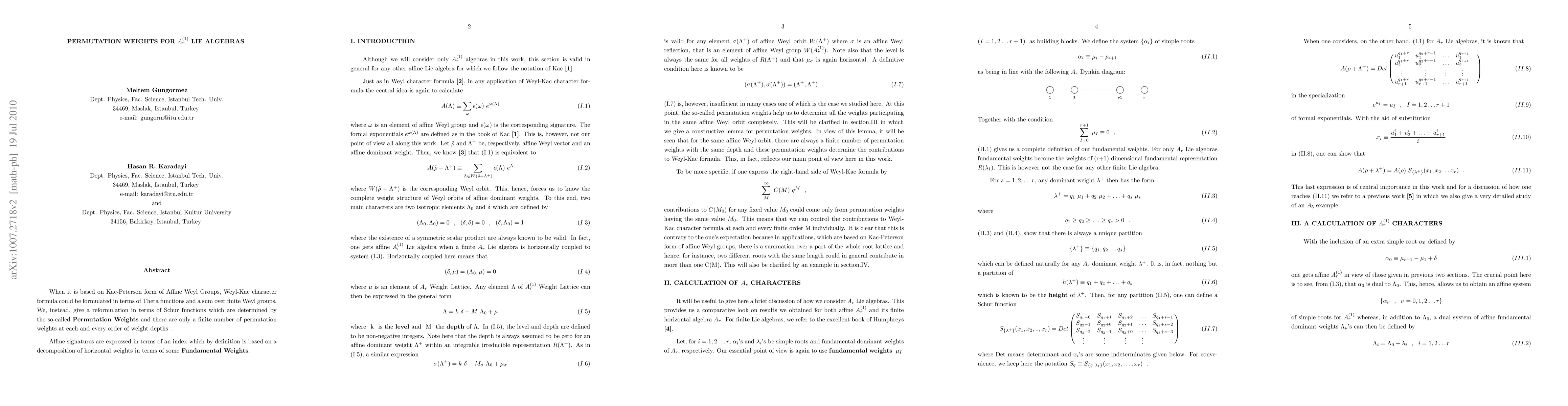 This paper reformulates the Weyl-Kac character formula for A_r^(1) Lie algebras using Schur functions, defined by finite permutation weights, instead of Theta functions. It introduces affine signatures through an index based on horizontal weights decomposed into fundamental weights.