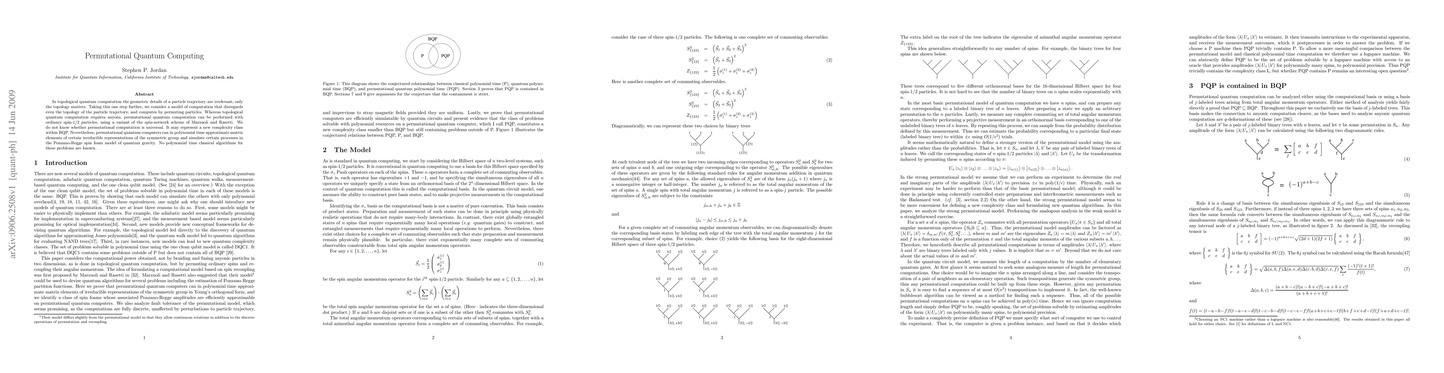 This paper proposes a novel model of permutational quantum computing that operates by permuting particles rather than relying on topological properties. It suggests that this approach, using ordinary spin-1/2 particles, can approximate matrix elements of the symmetric group and simulate quantum gravity processes, potentially representing a new complexity class within BQP.