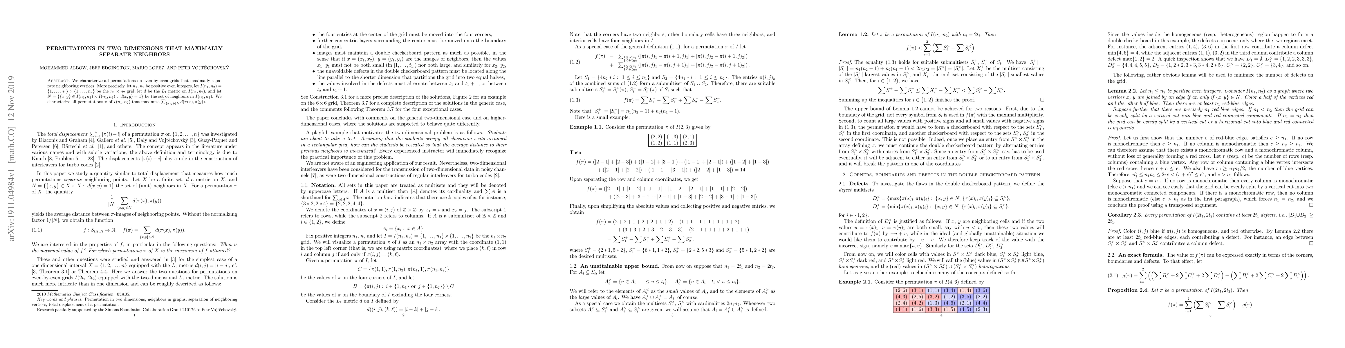 We characterize all permutations on even-by-even grids that maximally separate neighboring vertices. More precisely, let $n_1$, $n_2$ be positive even integers, let $I(n_1,n_2)=\{1,\dots,n_1\}\times\{1,\dots,n_2\}$ be the $n_1\times n_2$ grid, let $d$ be the $L_1$ metric on $I(n_1,n_2)$, and let $N=\{\{x,y\}\in I(n_1,n_2)\times I(n_1,n_2):d(x,y)=1\}$ be the set of neighbors in $I(n_1,n_2)$. We characterize all permutations $\pi$ of $I(n_1,n_2)$ that maximize $\sum_{\{x,y\}\in N} d(\pi(x),\pi(y))$.