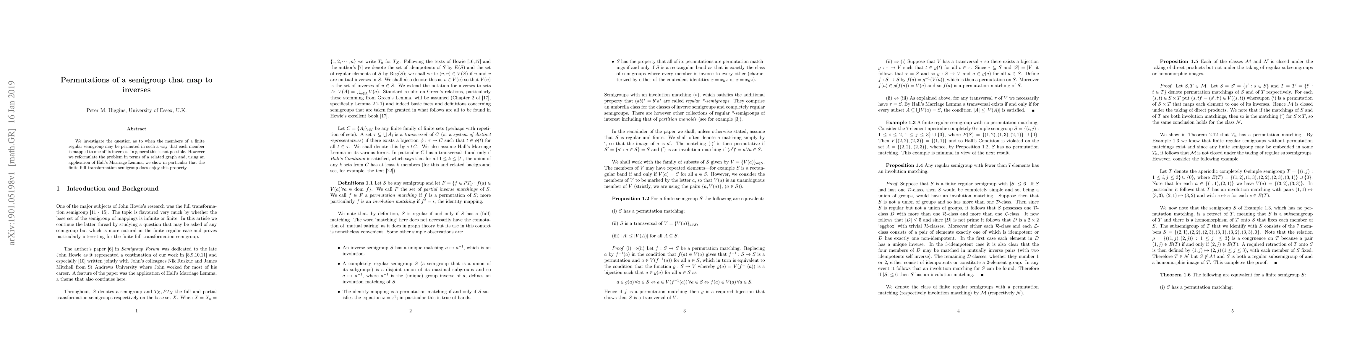 We investigate the question as to when the members of a finite regular semigroup may be permuted in such a way that each member is mapped to one of its inverses. In general this is not possible. However we reformulate the problem in terms of a related graph and, using an application of Hall's Marriage Lemma, we show in particular that the finite full transformation semigroup does enjoy this property.
